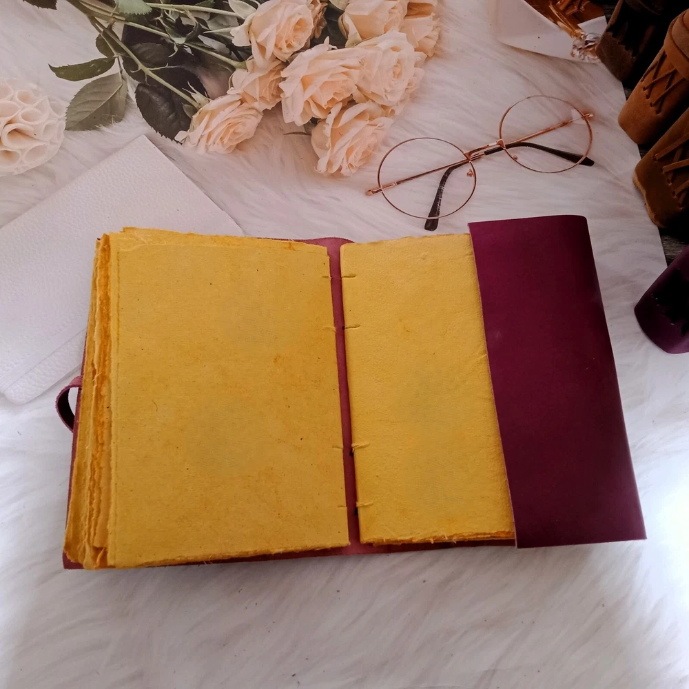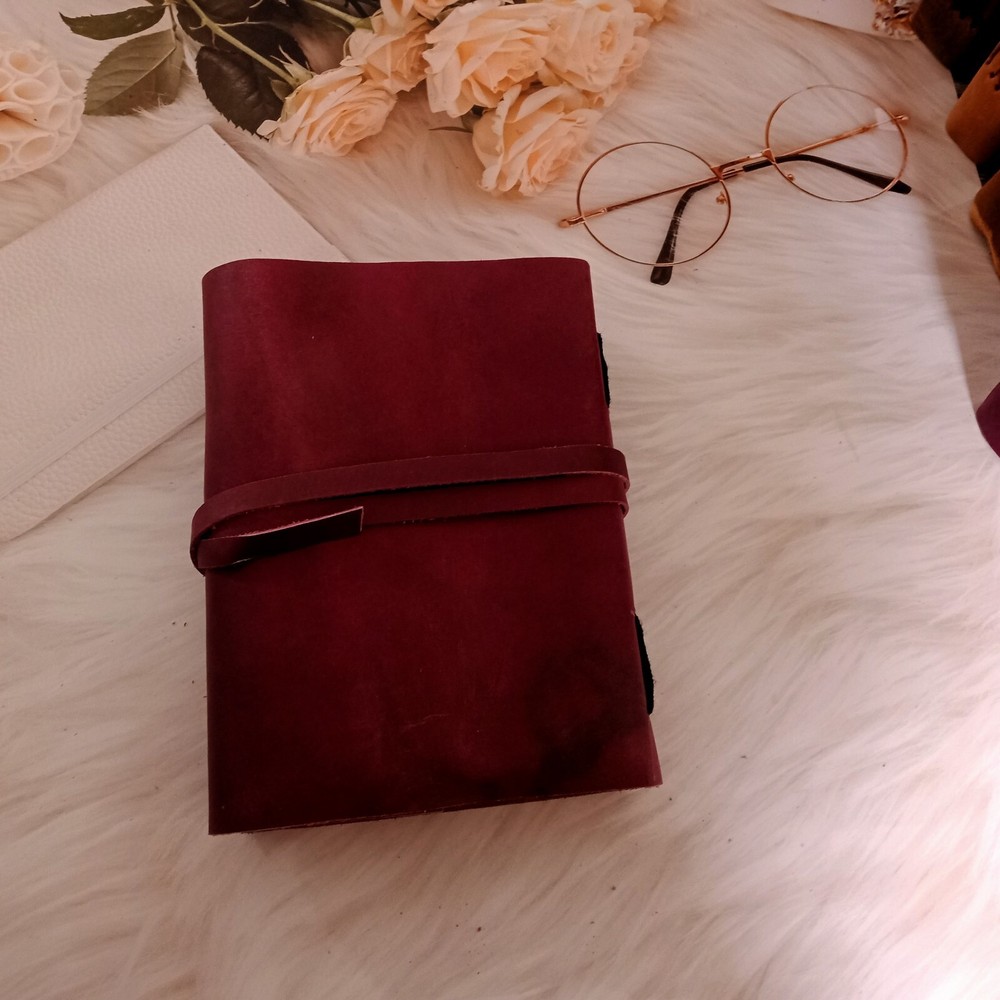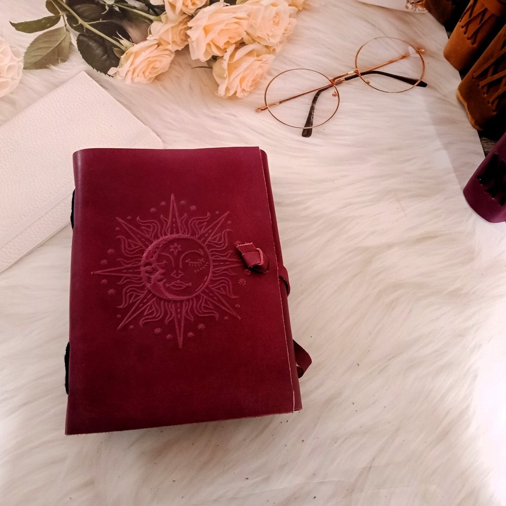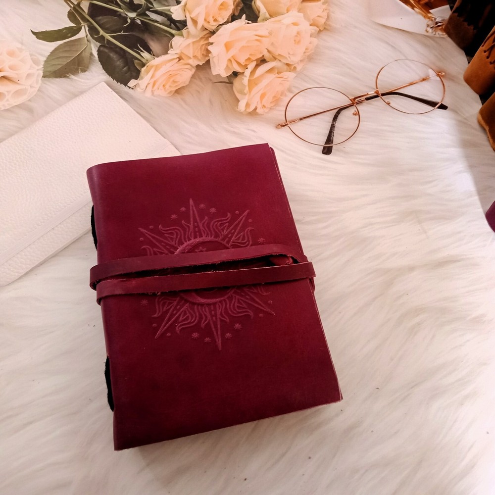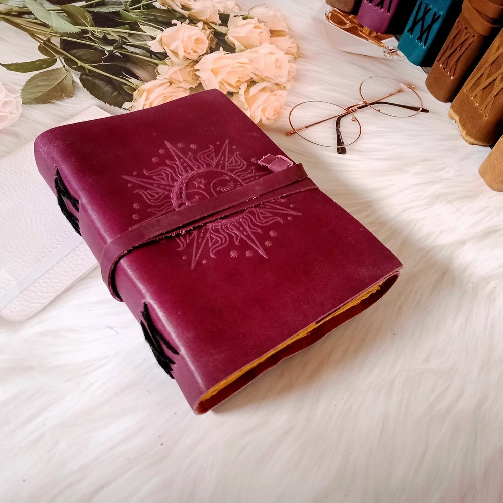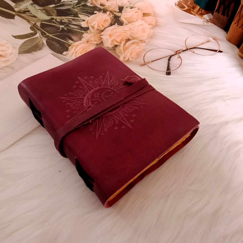 1. Introducing our exquisite burgundy leather journal with a stunning sun design, perfect for those seeking a unique and stylish notebook. Crafted with utmost precision, this Leather Journal Sun & Half Moon Embossed Notebook is not only a practical tool but also a work of art. The vibrant burgundy leather cover is adorned with an intricately embossed sun motif, adding a touch of elegance and charm to its overall appearance. 2. This journal is not just a regular notebook; it is a dream journal, a place where you can capture your thoughts, ideas, and aspirations. With 200 deckle-edged pages, you'll have ample space to pen down your deepest desires and cherished memories. The deckle edges give the pages a vintage and rustic feel, adding to the journal's overall charm. 3. The leather lace binding adds a touch of sophistication and ensures that your journal stays securely closed, protecting your precious writings. Whether you're using it as a personal diary, a sketchbook, or a wedding gift, this leather journal is sure to impress. Its versatility makes it suitable for various occasions and purposes. 4. The high-quality leather used in the construction of this journal ensures durability and longevity. It will age beautifully over time, developing a unique patina that tells the story of your journey. The smooth texture of the leather provides a comfortable writing experience, making it a pleasure to use. 5. Whether you're a writer, an artist, or simply someone who appreciates the beauty of a well-crafted journal, this burgundy leather journal with a sun design is a must-have. Its combination of functionality, elegance, and attention to detail makes it a standout piece. Treat yourself or someone special to this exquisite leather journal and let your creativity soar.
