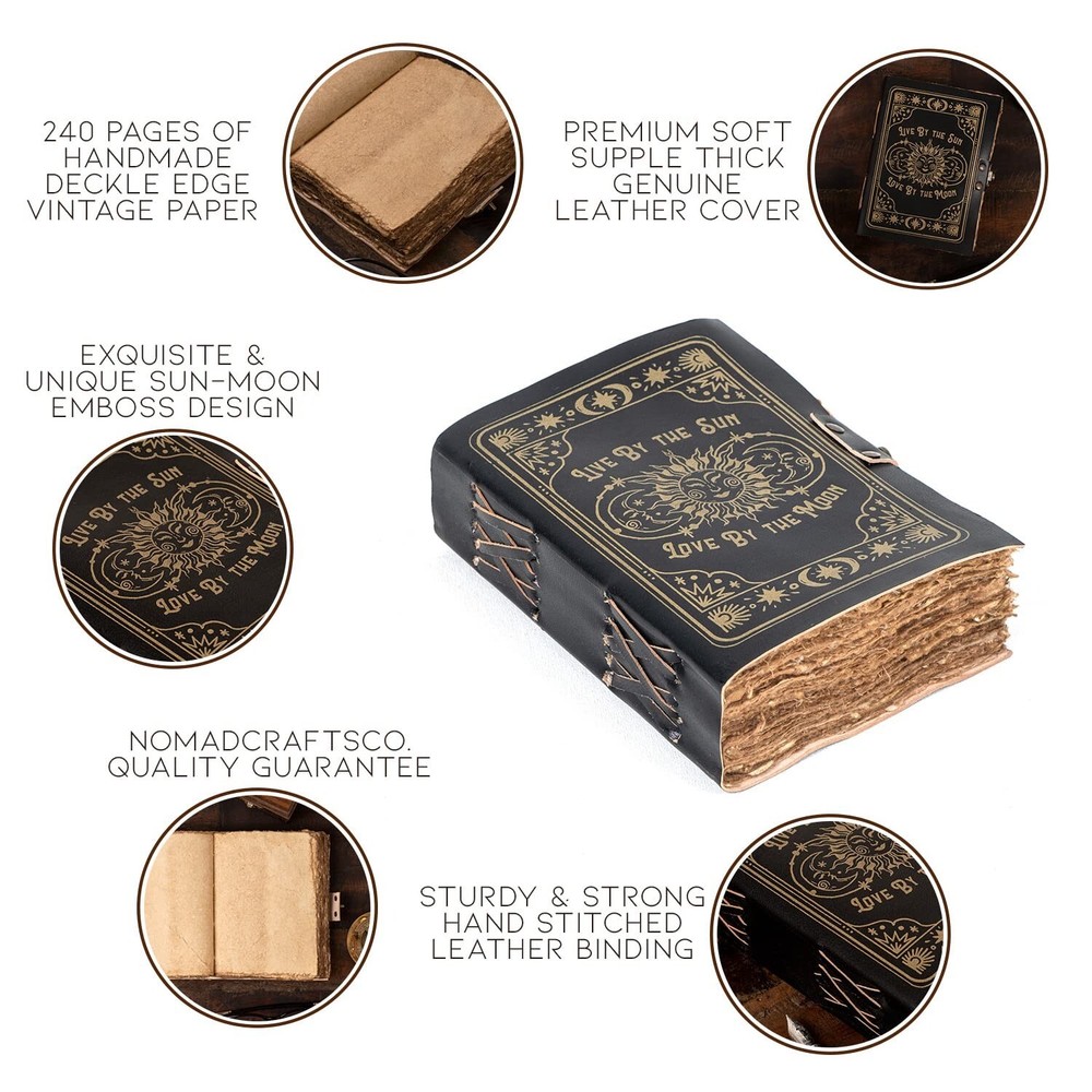 Leather Journal, Sun and Moon Vintage Journal, Leather Bound Journal | Journal for Men, Vintage Leather Journals, | Leather Sketchbook, Journals for Writing, Vintage Notebook Product Details Size: 7" x 5" Color: Black Brand: NomadCraftsCo. MPN: NOMAD-SUNM-BL-7-5 EAN: 5060892040572 UPC: Does not apply Manufacturer: NomadCraftsCo. Brand: NomadCraftsCo. Item Weight: 15.2 ounces Package Dimensions: 7.64 x 7.01 x 1.93 inches Item model number: NOMAD-SUNM-BL-7-5 Color: Black Cover Material: Leather Number of Items: 1 Size: 7" x 5" Ruling: Plain Sheet Size: 3 x 5 Manufacturer Part Number: NOMAD-SUNM-BL-7-5 Date First Available: April 27, 2022 small journal blank page journal notebook leather deckle edge paper leather journals for writing mens leather journal big journal leather journal for women vintage notebook journal leather bound journals antique diary journal handicrafts gift unique journals leather writing journal blank journal for women real leather notebook antique journal vintage notebooks handmade leather journal