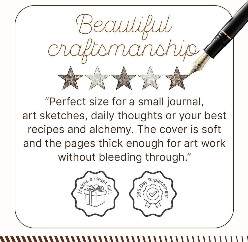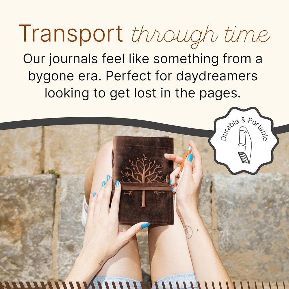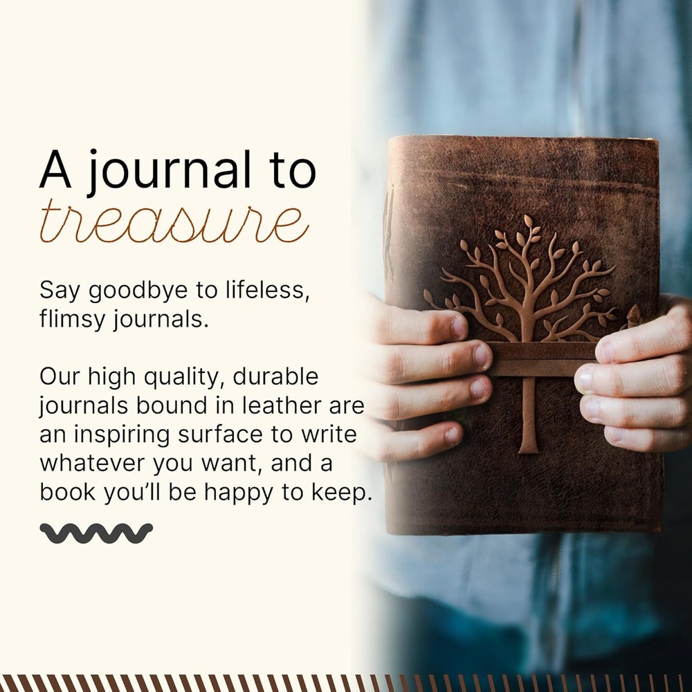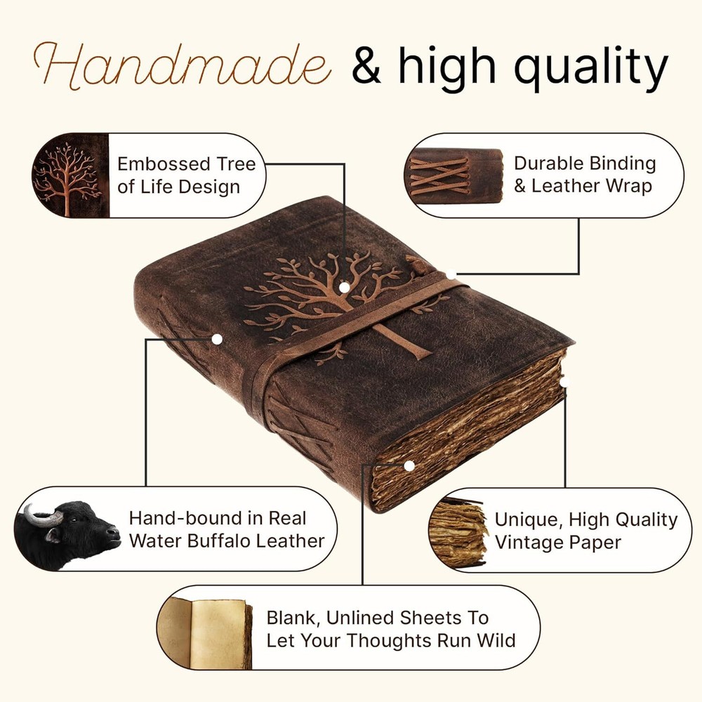 About this item UNIQUE HANDMADE VINTAGE PAPER - This Vintage Journal is made with 240 pages of Antique Paper which looks like it was pulled from history. You will fall in love with the antique handmade cotton paper which is very unique to this vintage journal. ANY KIND OF PEN - Sketch, doodle, or write on your Leather Bound Journal with a calligraphy pen, fountain pen, brush pen, ball pen, acrylic colors, watercolor, and many more. EXQUISITE & UNIQUE EMBOSSED TREE DESIGN - The Leather Bound Journal is made from thick dark brown water buffalo leather which is soft and supple to the touch. Extra care has been taken to ensure that the emboss is perfect in every piece. The leather is tanned with a special oil that will allow you to create your own distressed style if you fold the leather. These journals are made by gifted artisans using the best genuine leather available. STURDY BINDING AND LEATHER WRAPAROUND - Sturdy hand-stitched binding ensures that no paper comes loose from your vintage notebook. The leather wraparound keeps the papers of the journal safe and secure. Product dimensions: 11.89 x 9.65 x 2.32 inches