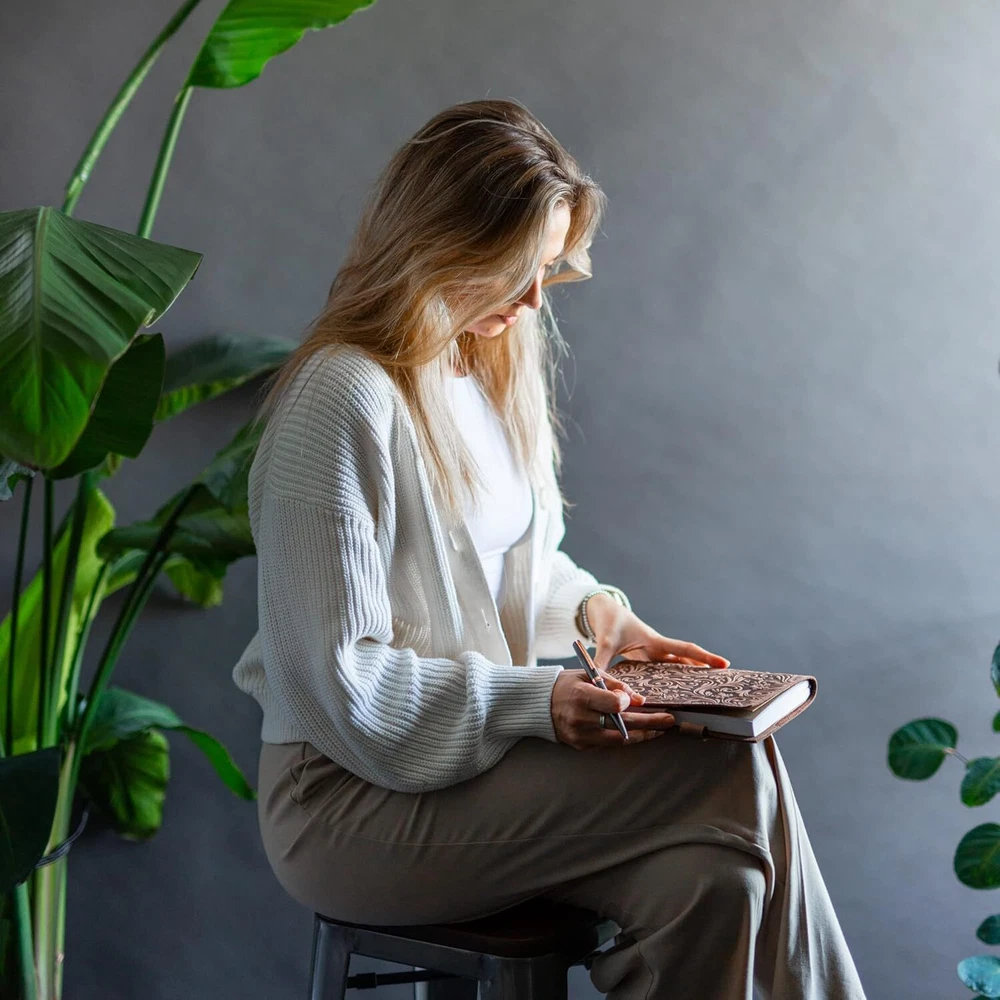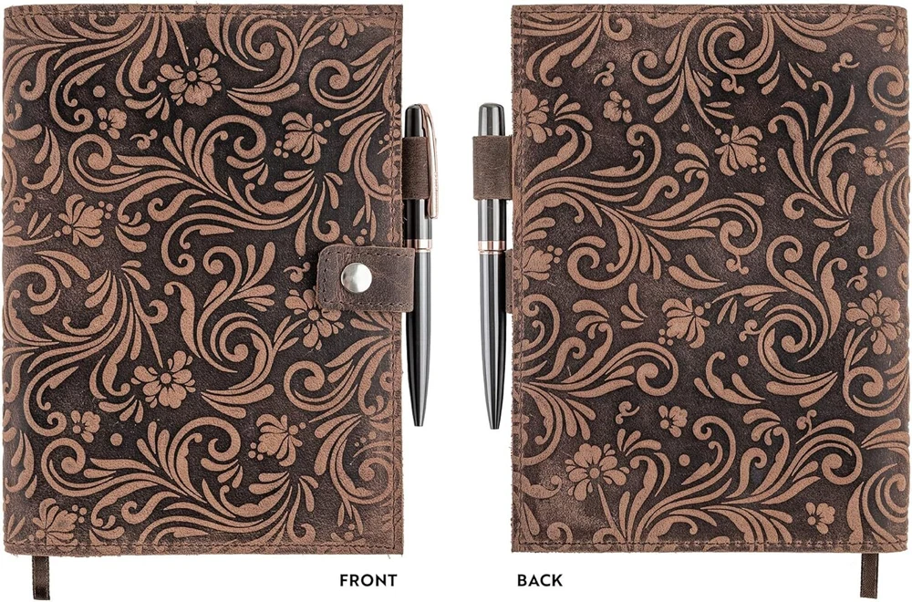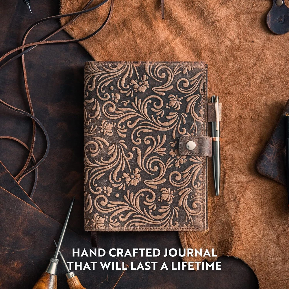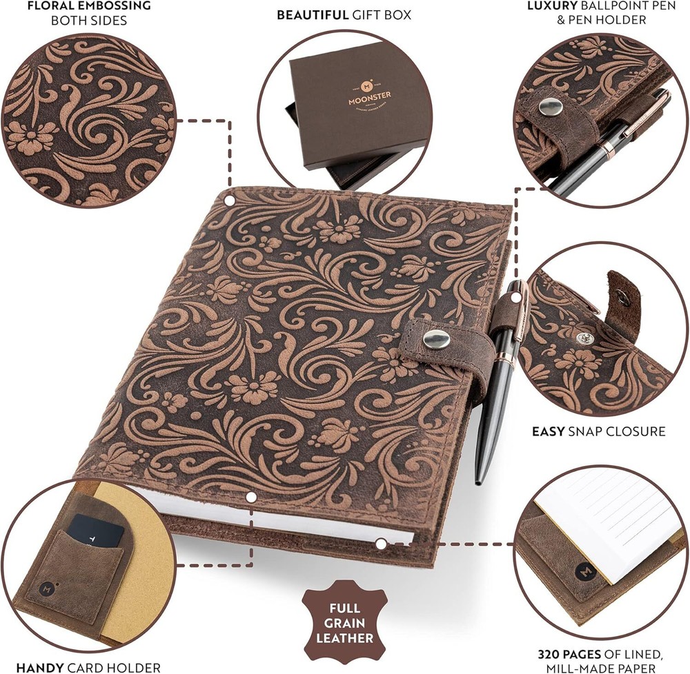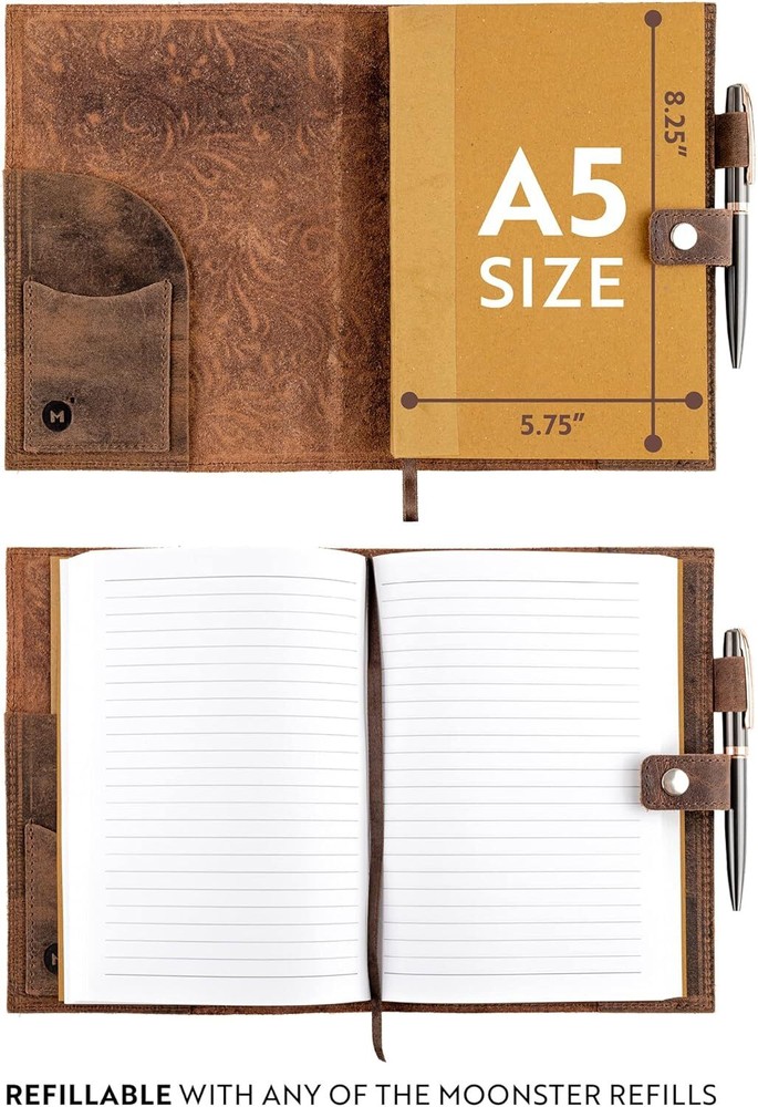 MADE WITH BUFFALO LEATHER: Our leather journals for women are bound with hand-cut, full grain buffalo leather for a beautifully authentic, vintage look. Measuring 8.75”x 6.25”, the a5 journal cover is embossed with a beautiful flower design that adds to its vintage theme. PREMIUM 70GSM LINED PAPER: Handcrafted in India using sustainable materials, our leather journal refillable is filled with 70GSM white lined milled paper that is perfect to write on. These refillable leather journal will inspire them to write their ideas and thoughts about everything their imagination will run into. WRITE IN STYLE FOREVER: Oozing rustic charm, as well as that gorgeous leather smell, the antique looking floral notebook can be used for life. These dark brown leather journals for writing women can vary in look & shade, making them unique inspirational gifts for women THE GIFT THAT GIVES BACK. For every purchase made, Moonster gives 5% of the profits to 5 charities in India, Zambia, Bolivia, UK and the USA. Not only that you get to create your women's leather journal, but also our charity recipients can get to create a better story. QUALITY AND CRAFTSMANSHIP: We’re passionate about making the world a better place. By designing and creating our refillable journal for women to the highest quality ethical goods, we support our chosen charities and offer reliable service.