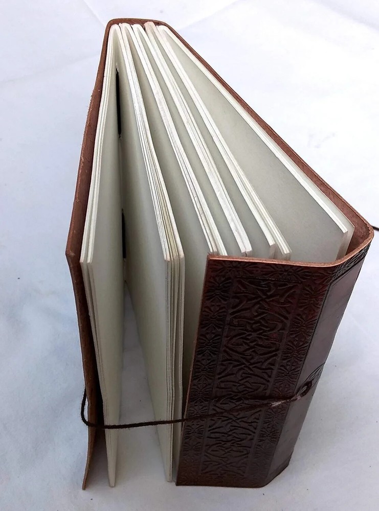 GENUINE DURABLE LEATHER :- Soft & Supple Designer Dark Brown Genuine Leather with a real leather scent. Naturally tanned with special oil, a special keepsake for your thoughts, plans & ideas. ✅ NON BLEEDING ENVIRONMENTAL FRIENDLY COTTON UNLINED HANDMADE PAPER :-Paper is produced using Cotton Bio-Mass and is also acid free. Any kind of pen and pencil can be used on this paper. 200 Pages (counting both sides). ✅ PERFECT SIZE FOR MANY USES :- Available in Two Size's, easy for handwriting, drawing or sketching and compact enough for carrying in your bag. Ideal for alternative Artists, Travelling, Business, Teen Journals, Poetry Work, Journalists, Food Planner, Scrapbook etc. ✅ HANDMADE AND TRADITIONAL CRAFTSMANSHIP:- Shri Krishna Handmade Craft is proud to bring more than 100 years’ experience of traditional Indian craftsmanship. Providing support to many Artists. ✅ VINTAGE AND ANTIQUE APPEARANCE :- Designed to stand out from the crowd. Hand cut asymmetric flap and cover with handmade paper. The leather wrap around strap effectively keeps your journal closed and also acts as a handy bookmark. This old-fashioned leather has an amazing smell! Size 10by13 Inches 10X13 inch