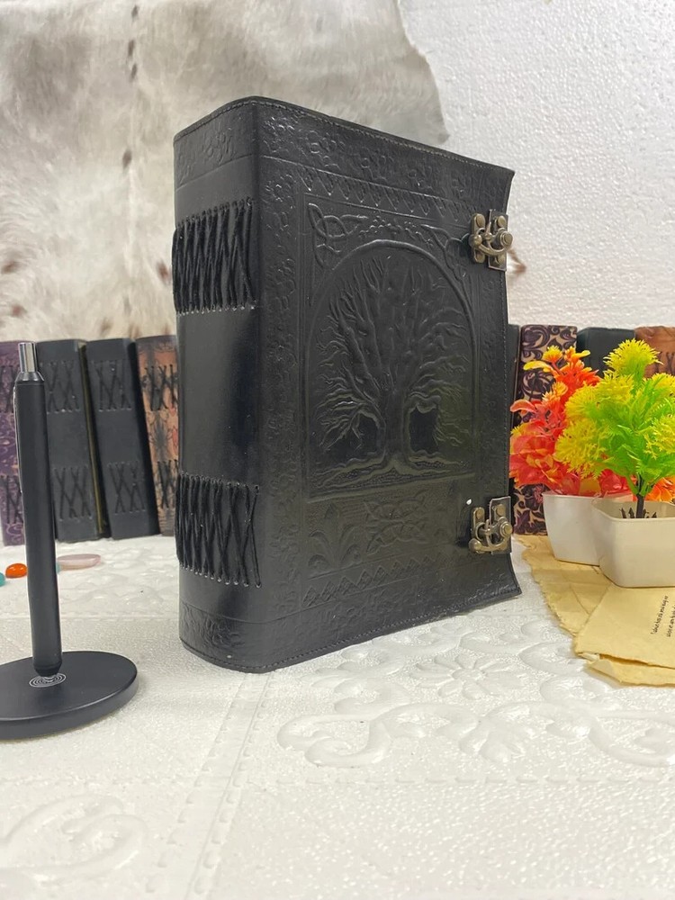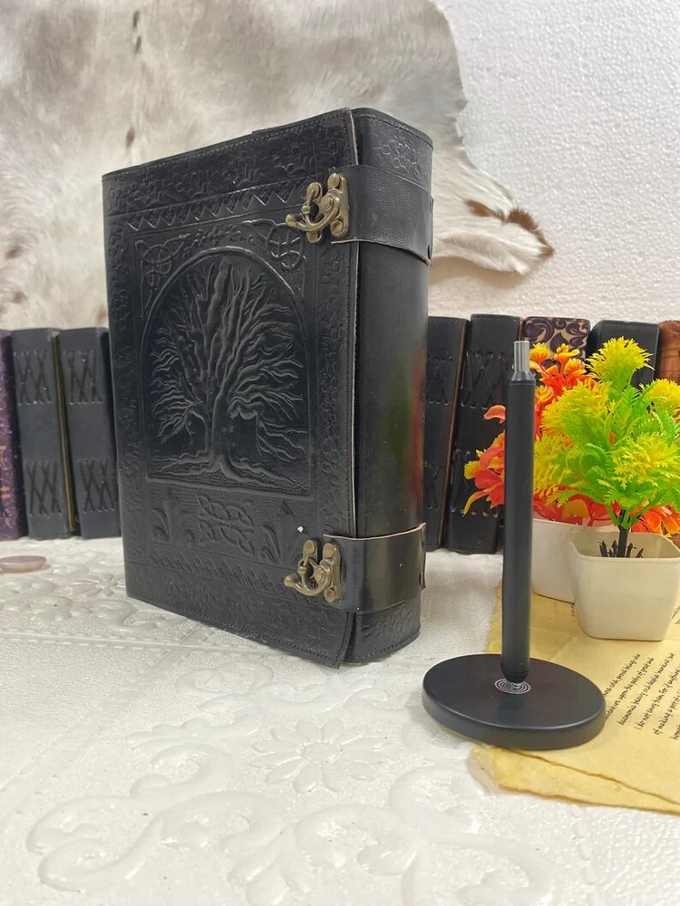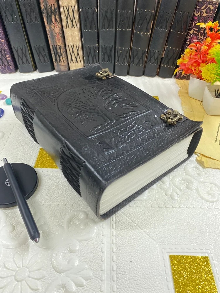 This luxurious leather-bound book featuring a Tree of Life design is a special edition item, perfect for those who appreciate handmade craftsmanship. With 600 personalized pages and a cover made from high-quality leather, this limited edition book is both elegant and unique. Made in India, this book is a must-have for anyone looking for a premium writing experience. Ideal for business or personal use, this exclusive item is sure to leave a lasting impression. embossed - Pentagram β’ Size - 10Γ7 inches β’ Color - Blacklπ€ β’ vintage lock closure β’ genuine leather β’ handmade cotton paper β’ 300 Sheet (600 pages both side) β Antique Paper - Vintage Journal is made of unique vintage paper which looks like it was pulled from history. You will love the old looking handmade cotton paper (200 pages) which is unique to our vintage journals. β Embossed - Pentagram embossed design, handmade leather journal notebook is very beautifully embossed. β VINTAGE LOCK AND STURDY BINDING - The vintage lock will keep all your valuable writing locked inside.Sturdy hand stitched binding to make sure that no paper comes out loose from your vintage notebook. β Use Any Kind Of Pen - Sketch, Doodle, Write on your journal notebook with a Calligraphy Pen Fountain Pen, Brush Pen, Ball Pen, Acrylic Colours, Watercolor and many more. β {Multiple Uses} β The vintage leather journal is a perfect sketchbook, drawing journal, great gift, book of shadows, grimoire journal , wicca journal , calligraphy journal, story writing, scrapbook, art journal, leather sketchbook, travel journal, journals for women and many more.