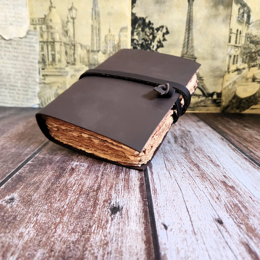 Leather journal, Brown journal, Dream journal, Wedding gift, Writing Journal, Leather lace Notebook, Dairy, sketchbook, Mother's day gift. 1. Introducing our exquisite leather journal with a sleek black strap, a perfect companion for all your writing endeavors. Crafted from high-quality leather, this journal exudes elegance and durability, ensuring it will withstand the test of time. Its rich brown color adds a touch of sophistication, making it a versatile accessory for any occasion. Whether you're jotting down your dreams, capturing your thoughts, or sketching your artistic visions, this journal is designed to inspire creativity and self-expression. 2. With its dream journal functionality, this leather lace notebook allows you to record your most vivid dreams and delve into the depths of your subconscious. The 200 deckle pages provide ample space for your thoughts, ideas, and artistic creations, making it an ideal sketchbook or writing journal. Its timeless design and intricate details make it a thoughtful and unique wedding gift or a cherished Mother's Day present. 3. This leather journal is not just a notebook; it's a piece of art that combines functionality with style. The black strap adds a touch of sophistication and ensures that your journal remains securely closed, protecting your precious memories and ideas. Its versatility makes it suitable for various purposes, whether you're using it as a diary, a sketchbook, or a writing journal. Treat yourself or your loved ones to this exquisite leather journal and embark on a journey of creativity and self-reflection.