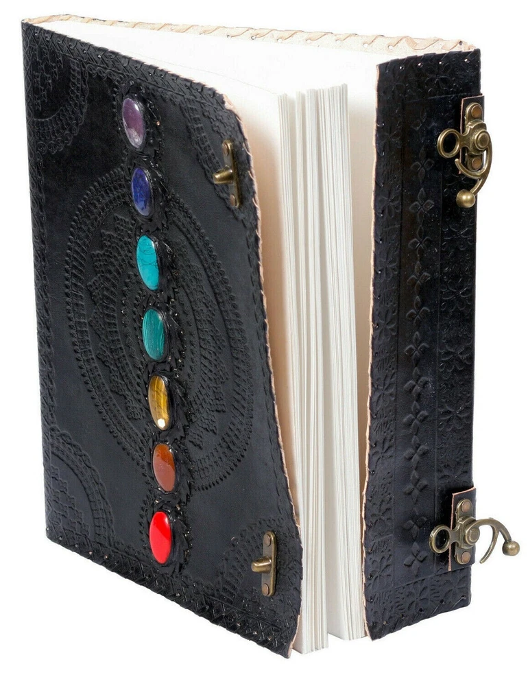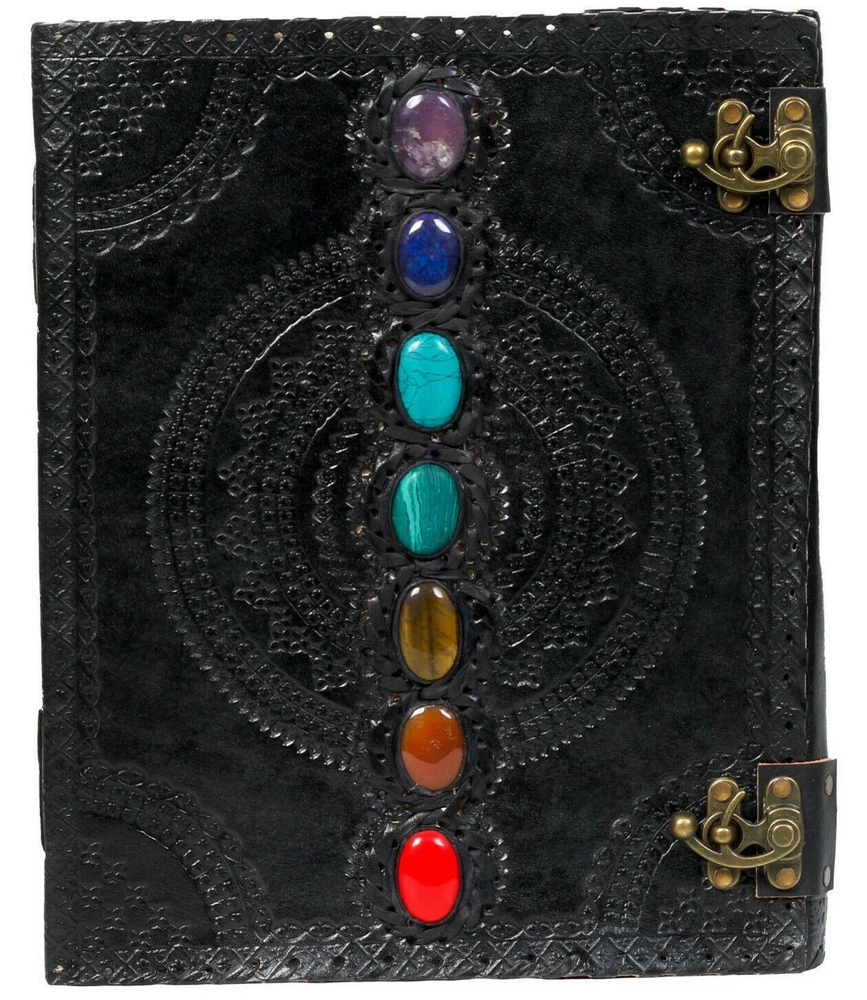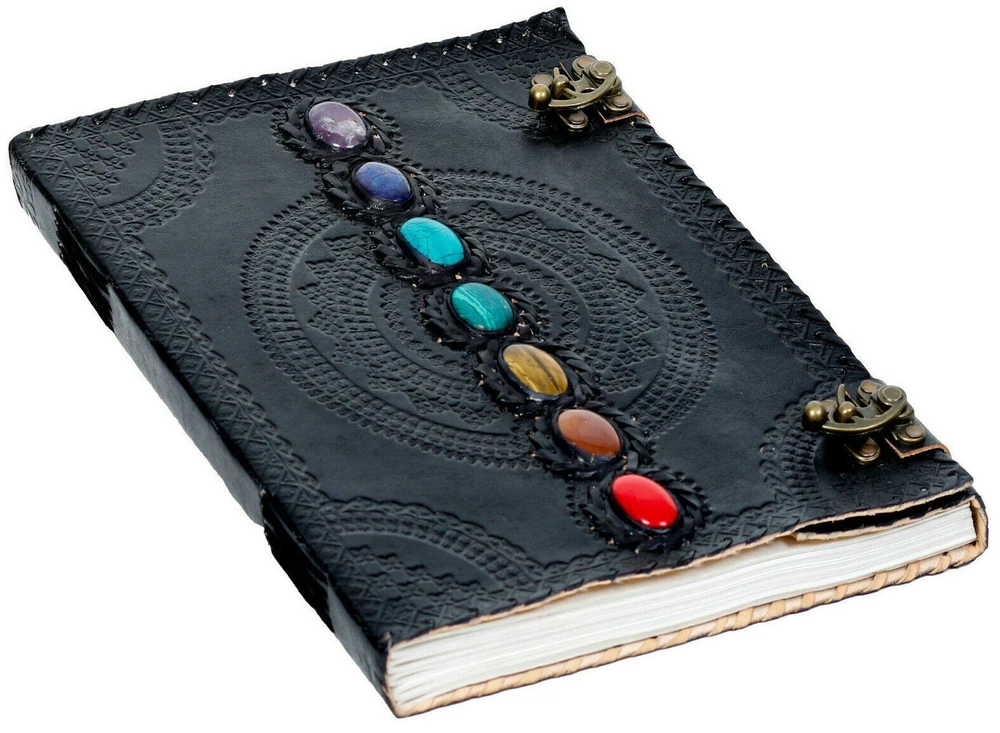 Introducing our exquisite black leather journal adorned with seven chakra stones, this product is a perfect blend of elegance and spirituality. Crafted with high-quality leather, this travel-friendly journal is designed to accompany you on your journeys, capturing your thoughts and experiences along the way. With its sleek black cover and the seven vibrant chakra stones, this journal not only serves as a practical notebook but also as a source of positive energy and balance. Whether you use it as a diary, notebook, or sketchbook, this leather journal is a must-have for those seeking both style and spiritual connection.