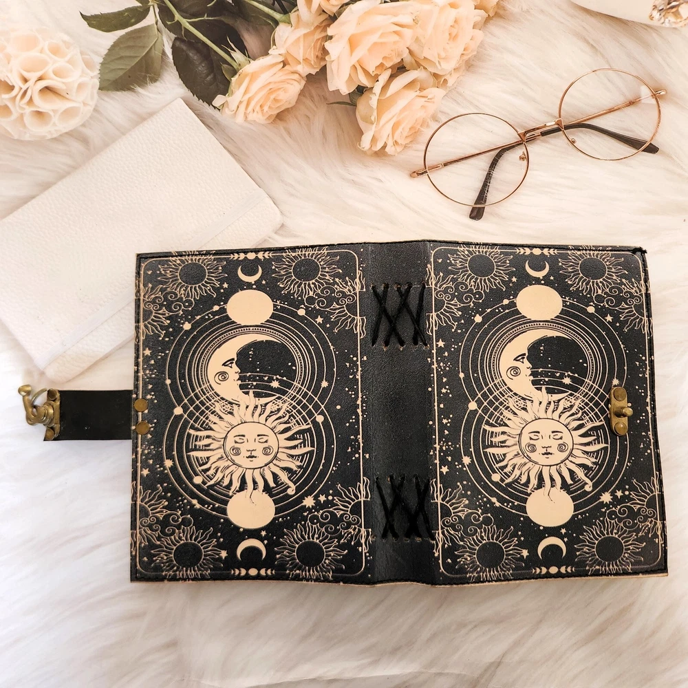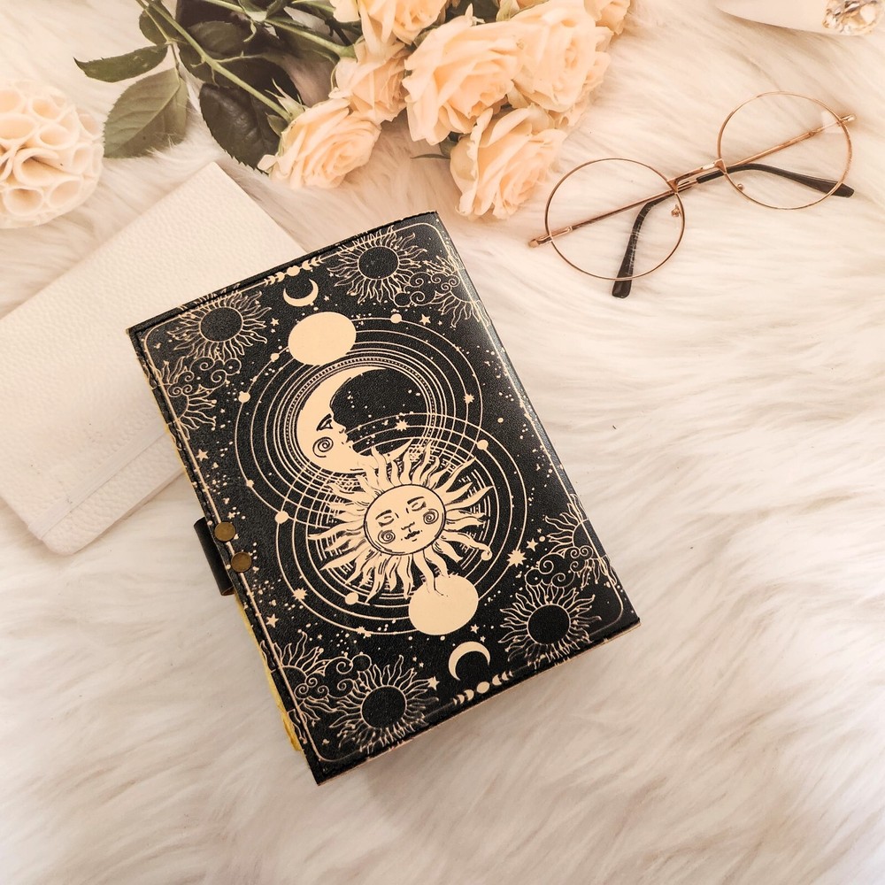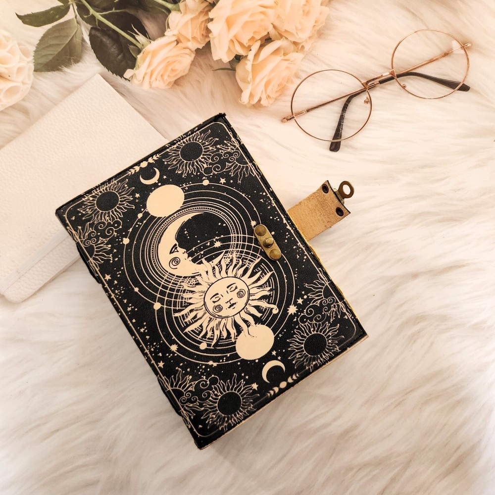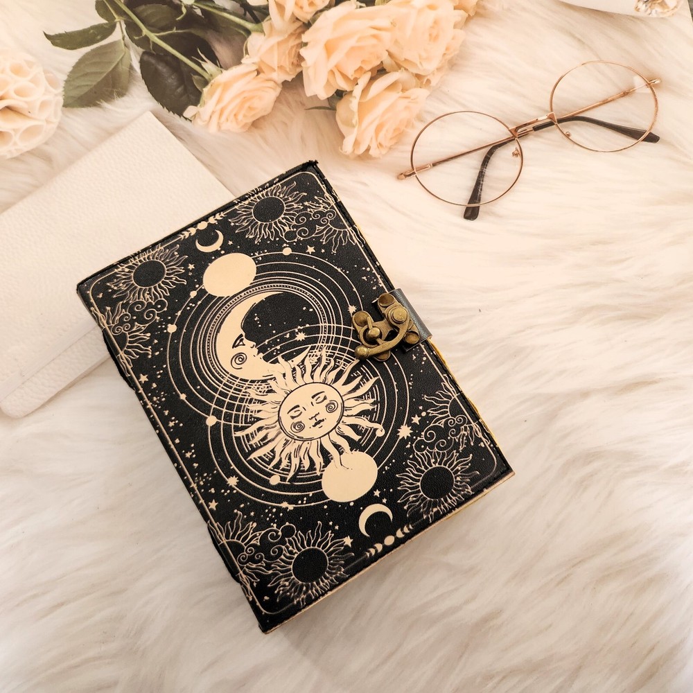 Handmade print sun & moon Leather Dairy,Notebook,Sketchbook,travel dairy 200 Deckle edge pages unique gift for love. Introducing our exquisite leather journal adorned with a captivating sun and moon design. Crafted from high-quality leather, this printed diary a luxurious feel and a timeless aesthetic. With 200 deckle edge pages, it offers ample space for your thoughts, ideas, and creative expressions. The journal also features a convenient c-lock for secure closure, making it an ideal gift for yourself or a loved one. Elevate your writing experience with this elegant and versatile journal.