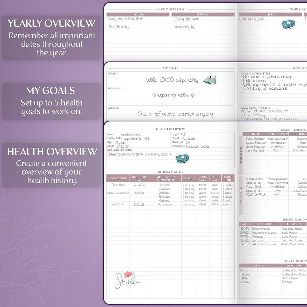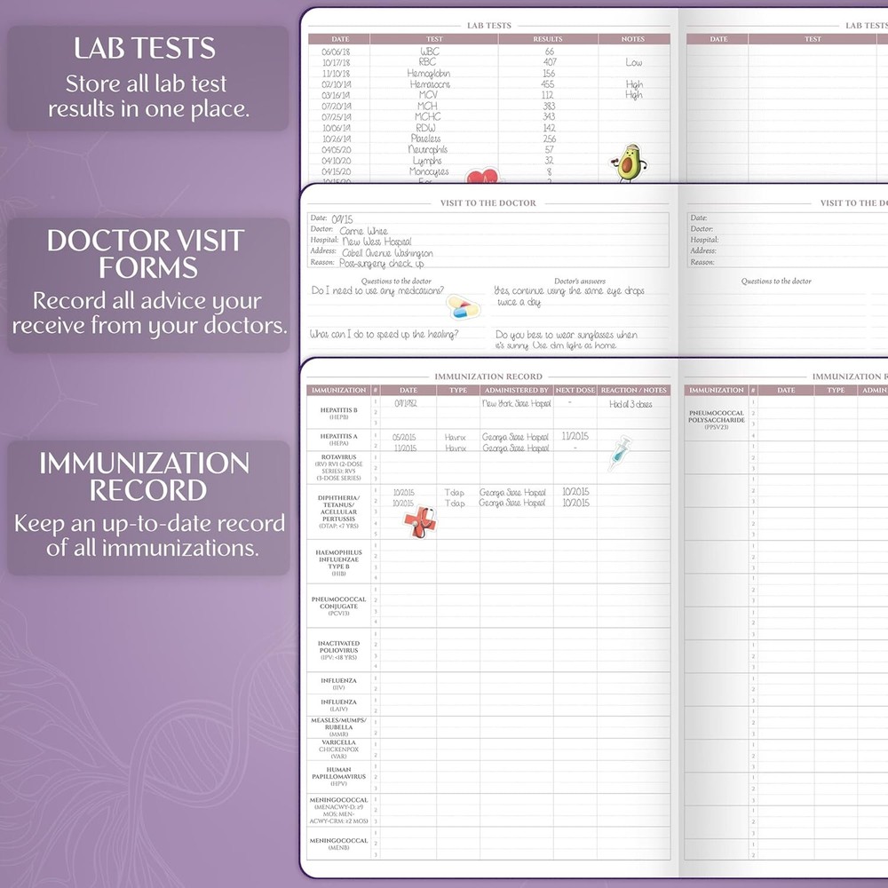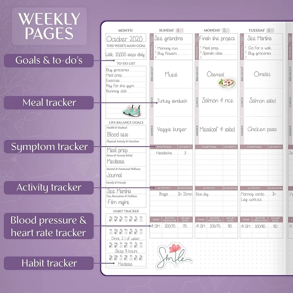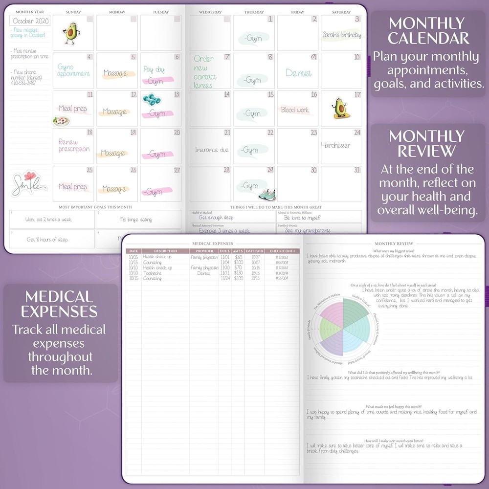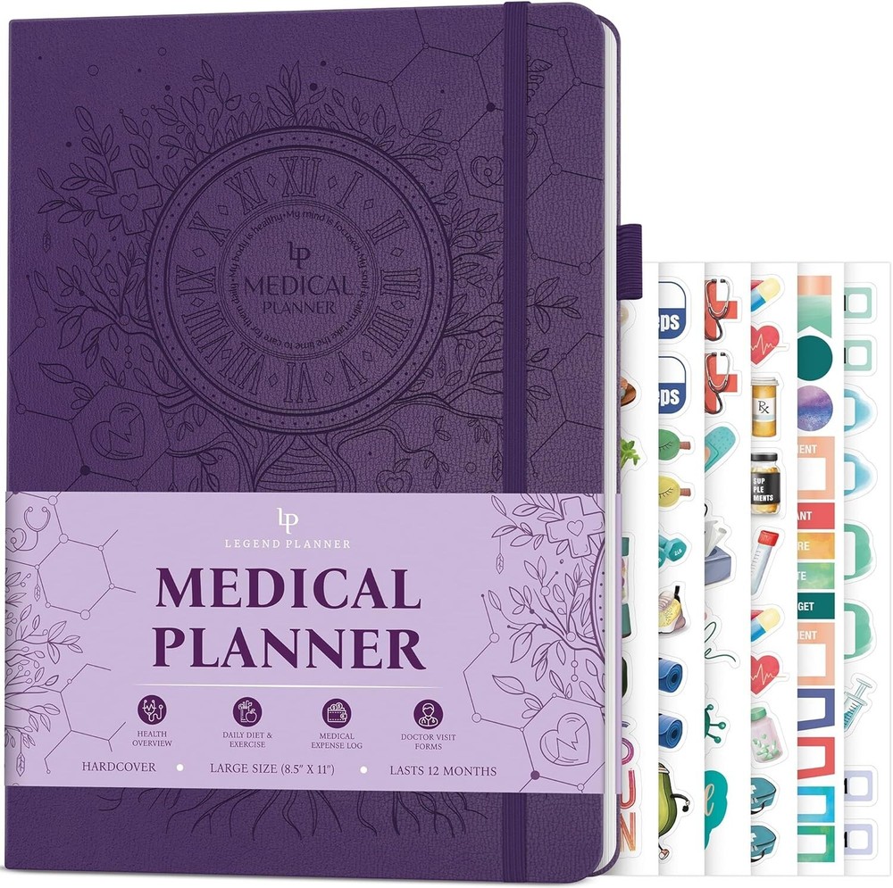 Legend Medical Planner – 12-Month Health Tracker Journal to Track Meals, Symptoms, Blood Pressure, Lab Test Results – Med & Wellness Notebook for Daily Self-Care & Health Goals (Purple) AN EASY WAY TO KEEP YOUR MEDICAL INFORMATION ORGANIZED – This 12-month medical planner is a convenient tool to store all essential health and medical information in one place, from your health history to medical expenses and lab test results. TRACK MEALS, SYMPTOMS, ACTIVITY, BLOOD PRESSURE & MORE – This medical notebook helps you track your daily food intake, symptoms, physical activity, blood pressure, heart rate, habits, and medical expenses – all in one place. STORE MEDICAL CONTACTS, LAB TEST RESULTS & DOCTORS’ ADVICE – Inside the health planner, you will find dedicated sections to store helpful medical contacts, lab test results, immunization records, and advice you receive from your doctors. DURABLE & COMFORTABLE TO USE DAILY – The med notebook has a durable, vegan leather hardcover, thick 120gsm paper, 3 ribbon bookmarks, a pen loop, an elastic band, lay-flat binding, a pocket for loose notes, 4 sheets of stickers, and a user guide. health tracker journal.