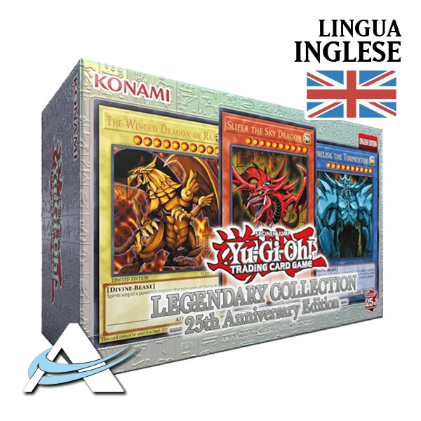 Nuovo & Sigillato Uno dei primi e più famosi oggetti di Yu-Gi-Oh! GIOCO DI CARTE COLLEZIONABILI torna per il 25esimo anniversario del gioco di carte! La primissima Collezione Legendaria ritorna come Collezione Leggendaria 25th Anniversary ! Contiene 6 buste di espansione e 6 carte Ultra Rare inclusa una carta variant speciale di alcuni dei più famosi mostri della serie originale del cartone animato. In aggiunta alle 6 carte Ultra Rare che includono le richiestissime promo delle carte Divinità Egizie, l'edizione 25° Anniversario include una settima carta bonus. La settima carta offrirà ai duellanti un'anticipazione su una nova rarità creata apposta per il 25esimo anniversario: il Quarter Century Secret Rare ! Ogni Collezione Leggendario 25° Anniversario includerà una carta random Quarter Century Secret Rare di 6 carte speciali variant. Ciascuna Collezione Leggendario 25° Anniversario contiene: 1 Busta di Leggenda del Drago Bianco Occhi Blu 1 Busta di Predoni Metallici 1 Busta di Sovrano della Magia 1 Busta di Servitore del Faraone 1 Busta di Crisi Oscura 1 Busta di Invasione del Chaos 1 Carta Ultra rara per ciascuno dei seguenti mostri Obelisk il Tormentatore , Slifer il Drago del Cielo , il Drago Alato di Ra , Drago Bianco Occhi Blu , Mago Nero , Drago Nero Occhi Rossi e una carta Quarter Century Secret Rare delle carte appena citate. Factory Sealed One of the first and most famous items from Yu-Gi-Oh! TRADING CARD GAME returns for the 25th anniversary of the card game! The very first Legendary Collection returns as the Legendary Collection 25th Anniversary ! Contains 6 booster packs and 6 Ultra Rare cards including a special variant card of some of the most famous monsters from the original cartoon series. In addition to the 6 Ultra Rare cards that include the highly requested Egyptian God card promos, the 25th Anniversary Edition includes a seventh bonus card. The seventh card will offer duelists a sneak peek at a new rarity created especially for the 25th anniversary: the Quarter Century Secret Rare ! Each Legendary Collection 25th Anniversary Edition will include a random Quarter Century Secret Rare card of 6 variant special cards. Each Legendary Collection 25th Anniversary Edition contains: 1 Legend of Blue-Eyes White Dragon booster pack 1 Metal Raiders booster pack 1 Spell Ruler booster pack 1 Pharaoh's Servant booster pack 1 Dark Crisis booster pack 1 Invasion of Chaos booster pack 1 Ultra Rare card for each of the following monsters Obelisk the Tormentor , Slifer the Sky Dragon , Winged Dragon of Ra , Blue-Eyes White Dragon , Dark Magician , Red-Eyes Black Dragon , and one Quarter Century Secret Rare card of the above cards.