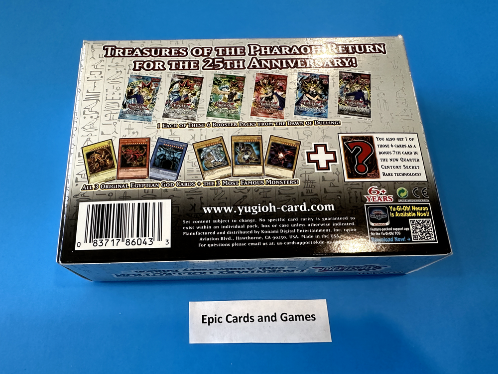 You are bidding o n : 1 x Yu-Gi-Oh Legendary Collection: 25th Anniversary Edition Mini Box (6 Packs + 6 Holo + 1x Quarter Century Secret Rare per mini box) ( 25th ) Each Mini box come with the following: One of the most storied Yu-Gi-Oh! TRADING CARD GAME items returns for the 25th anniversary of the card game! The very first Yu-Gi-Oh! TRADING CARD GAME Legendary Collection is reborn as Legendary Collection: 25 th Anniversary Edition ! It contains 6 Booster Packs and 6 Ultra Cards, including special variant cards of some of the most famous monsters from the original anime series. In addition to the 6 Ultra Rare cards, which include the highly requested and sought-after original Egyptian God Card Promos, the 25 th Anniversary Edition will include a bonus 7th card! This 7 th card will offer Duelists a sneak peek at a brand-new rarity created just for the 25 th anniversary celebrations: The Quarter Century Secret Rare ! Each Legendary Collection: 25 th Anniversary Edition will include 1 random Quarter Century Secret Rare version of 1 of the 6 special variant cards to give Duelists a taste of what’s to come! Legendary Collection: 25 th Anniversary Edition contains: 1 pack of Legend of Blue-Eyes White Dragon , 1 pack of Metal Raiders , 1 pack of Spell Ruler , 1 pack of Pharaoh’s Servant , 1 pack of Dark Crisis, 1 pack of Invasion of Chaos, 1 Ultra Rare Obelisk the Tormentor card, 1 Ultra Rare Slifer the Sky Dragon card, 1 Ultra Rare The Winged Dragon of Ra card, 1 Ultra Rare Blue-Eyes White Dragon card, 1 Ultra Rare Dark Magician card, 1 Ultra Rare Red-Eyes Black Dragon card, and 1 Quarter Century Secret Rare version of 1 of the 6 aforementioned cards (random). Please check pictures for more detail. Condition: Brand new and unopened . Please see pictures for condition. Picture is a stock photo but you will get 1 from the box Payment is due within 5 days of the end of this auction. (If we don't have an item in stock due to inventory problems etc, we will refund your payment immediately, please understand these things happen and we try our best to make sure they don’t but mistakes can happen.) Shipping : Handling time: 1 - 3 days *“Business days” are normal weekdays. Saturdays, Sundays, and major holidays do not count as business days. Canada Post Tracked / Expedited within Canada and USA ( Chat Chits Select for Canada) or FedEx Ground to Canada / FedEx International Ground to USA ( S hipping is calculated based on your location. ) Epic Cards and Games Any questions feel free to email us and allow 1 day for a response. Thanks for looking! Sales Tax (Canada Only) : Purchases made by Canadian residents are subject to applicable GST/HST, depending on your province/territory. (If you do not agree to this, please do not bid. We have a registered business in Canada and are required by law to charge taxes to anything shipped within the country.) Thank you for shopping with Epic Cards and Games (Box 21x16x12 cm)