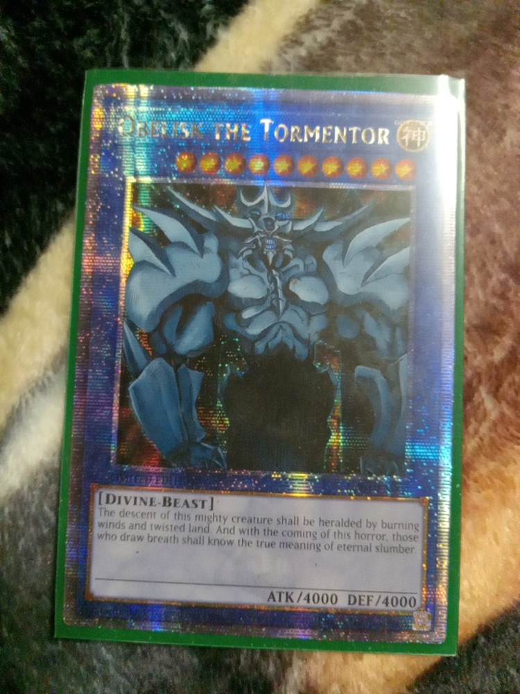 The product is a Limited Edition Quarter Century Secret Rare Obelisk The Tormentor card from the Yu-Gi-Oh! TCG's Legendary Collection: 25th Anniversary Edition. This card is a Divine-Beast type with high defense and attack power of 4000, making it a powerful addition to any collection. Manufactured by Konami, this Normal type card with a Holo finish is in near mint or better condition, making it a valuable and sought-after item for collectors and players alike.