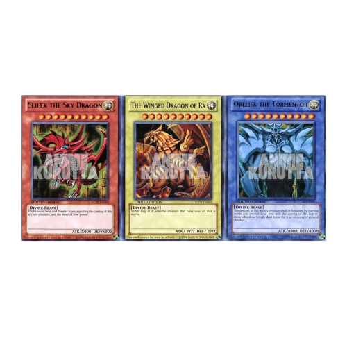 Please Note : These cards are promotional and are meant for collectors only as these can not be used in a tournament. YuGiOh Legendary Collection Set of 3 Egyptian God Cards Slifer, Obelisk, Ra LC01. Here are three of the most popular, most requested, and most sought after monsters ever created. Wield the power of Marik's Winged Dragon of Ra, Kaiba's Obelisk The Tormentor or Yugi's Slifer The Sky Dragon. The Egyptian God Cards! Previously available only as limited release, hard to find promotional items. This is a rare chance to get all three of the original Egyptian God cards for yourself! Obelisk with the blue card back. Slifer with the red card back. Ra with the yellow card back. Not tournament legal.
