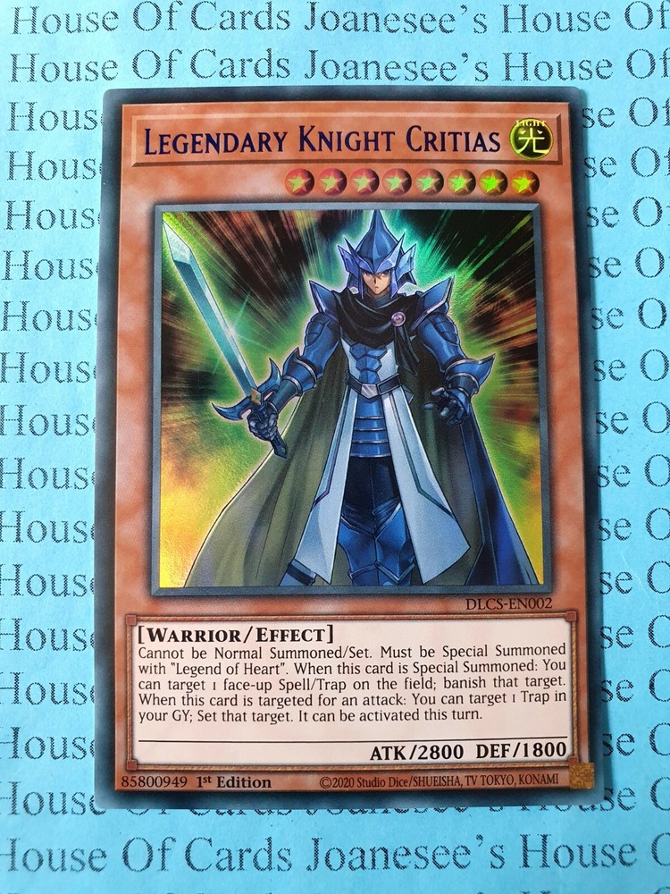 This is the Ultra Rare Holo Light Warrior (Blue Title) Legendary Knight Critias 8 Stars ATK/2800 DEF/1800 Card text: Cannot be Normal Summoned/Set. Must be Special Summoned with "Legend of Heart". When this card is Special Summoned: You can target 1 face-up Spell/Trap on the field; banish that target. When this card is targeted for an attack: You can target 1 Trap in your GY; Set that target. It can be activated this turn. DLCS-EN002 1st Edition English Mint Condition Totally Original Konami (or your money back!) I will deliver in safe packaging to keep it in perfect condition. Ideal for players and collectors alike. Check out my other items! I will combine postage costs for multiple purchases. Sign up for my email newsletters by adding my eBay Shop to your favourites
