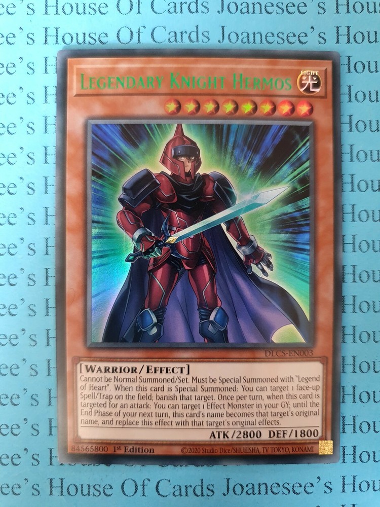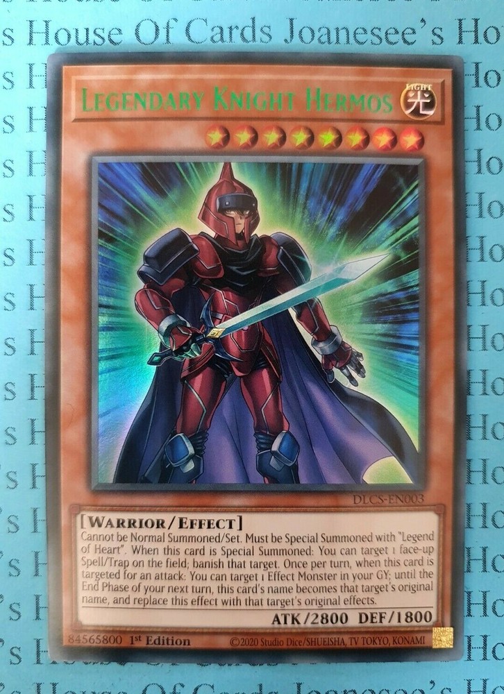 This is the Ultra Rare Holo Light Warrior (Green Title) Legendary Knight Hermos 8 Stars ATK/2800 DEF/1800 Card text: Cannot be Normal Summoned/Set. Must be Special Summoned with "Legend of Heart". When this card is Special Summoned: You can target 1 face-up Spell/Trap on the field; banish that target. Once per turn, when this card is targeted for an attack: You can target 1 Effect Monster in your GY; until the End Phase of your next turn, this card's name becomes that target's original name, and replace this effect with that target's original effects. DLCS-EN003 1st Edition English Mint Condition Totally Original Konami (or your money back!) I will deliver in safe packaging to keep it in perfect condition. Ideal for players and collectors alike. Check out my other items! I will combine postage costs for multiple purchases. Sign up for my email newsletters by adding my eBay Shop to your favourites
