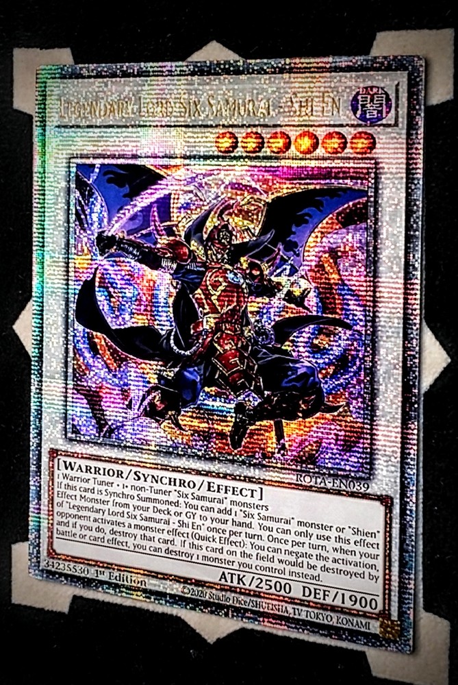 Card Name : Legendary Lord Six Samurai - Shi En Rarity : Quarter Century Secret Rare Set code : ROTA-EN039 Print Run : 1st Edition Region of Print : Europe Condition : Near mint or better Postage : Will be sent toploaded with a hard back envelope.