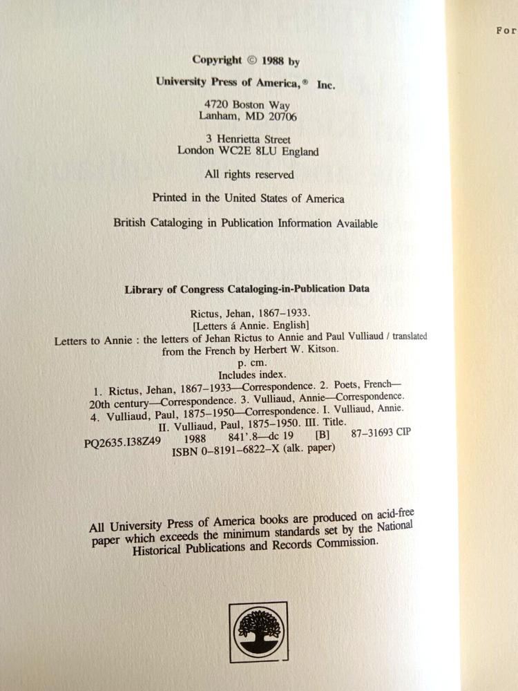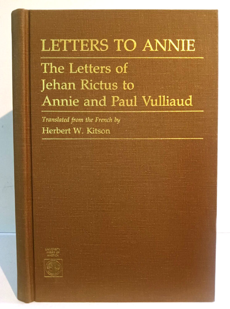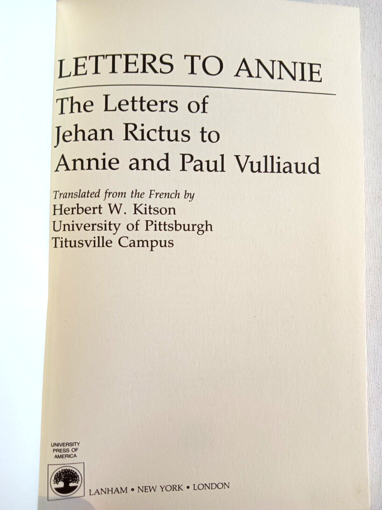 Title: Letters to Annie: The Letters of Jehan Rictus to Annie and Paul Vulliaud, Translated from the French by Herbert W. Kitson, 1988 First Edition Publisher: University Press of America Condition: Near Fine/ Near New - 9 1/4" x 6 1/8" - 84 numbered pages Description: Tight and clean cloth boards show as seldom opened with some very light shelf wear and foxing to the end pages from storage. Clean intact interior. Near Fine. Quality packed -Shipping is included in the price Please note: no returns Ask all questions prior to purchase Thanks so much!