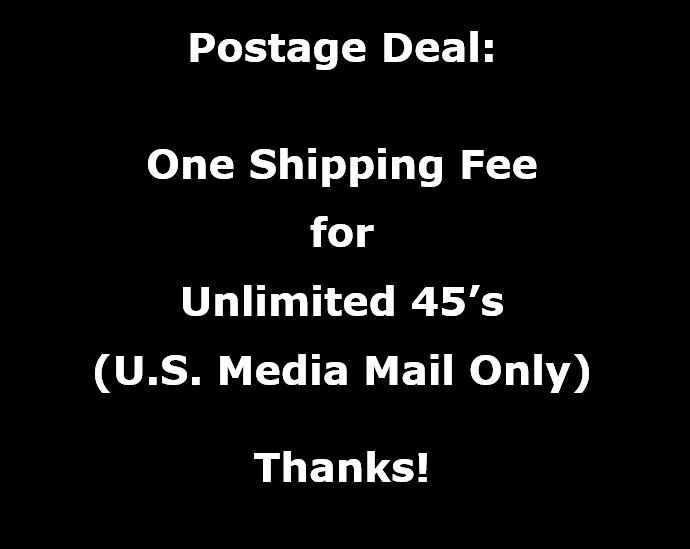Record is shiny VG with light scuffs and jukebox wear. Plays well with moderate steady background noise. Still enjoyable. All 45's after the first one ship free to U.S. buyers. To get the shipping deal, put all items in your shopping cart BEFORE you pay. The shopping cart should apply your discount at checkout, but if you're overcharged on the shipping, I'll refund the extra when I print the label. Grading as follows: Near Mint=Like New or Very Close. VG++ or EX=Slight Wear/Close to Near Mint. VG+=Mild Wear/Nothing Serious. VG=Noticeable Scuffs and/or Mild Scratches but Still Enjoyable. The play grade is guaranteed to be as good as or better than the visual grade stated, unless I say differently. Fast shipping! I have forty years of experience as a record collector and dealer. I grade all records by strict standards and guarantee that every item is exactly as I state. I always include any minor defects in the description, rather than leaving you to be disappointed later. Please check out my eBay store for lots more quality inventory! Note: Descriptive phrasings (beyond actual titles and standard condition terminology), eBay store and RetroHeaven names and logos, and all photographs are copyrighted to Suzie's Record Room and may not be duplicated.