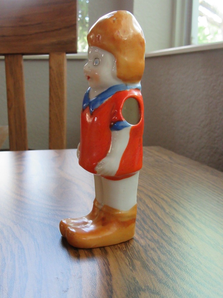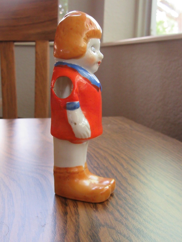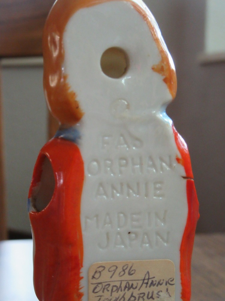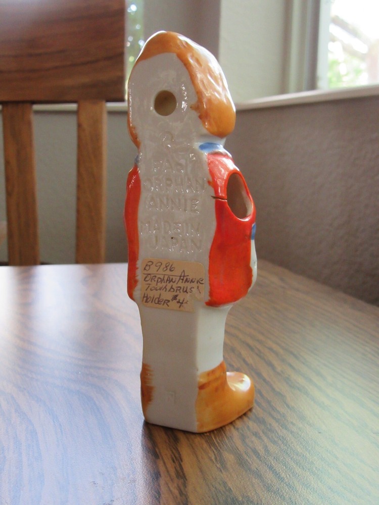 Mid 1930s Little Orphan Annie glazed bisque toothbrush holder. Clearly marked on back "Orphan Annie Made in Japan". Piece measures approx. 5 1/2" inches tall. Paint is perfect. Looks great. Winner will not be disappointed. Please email with questions you might have.