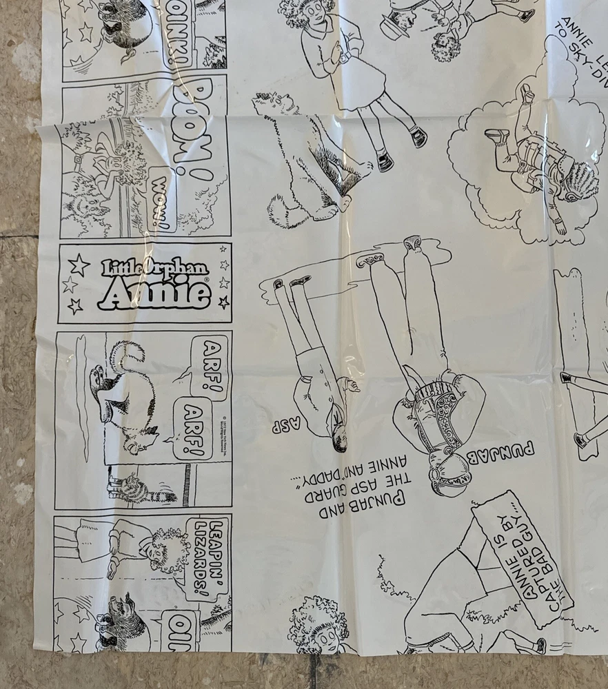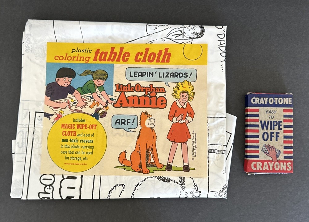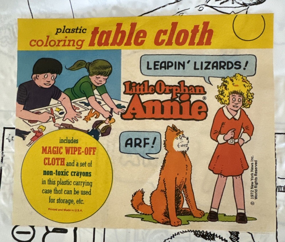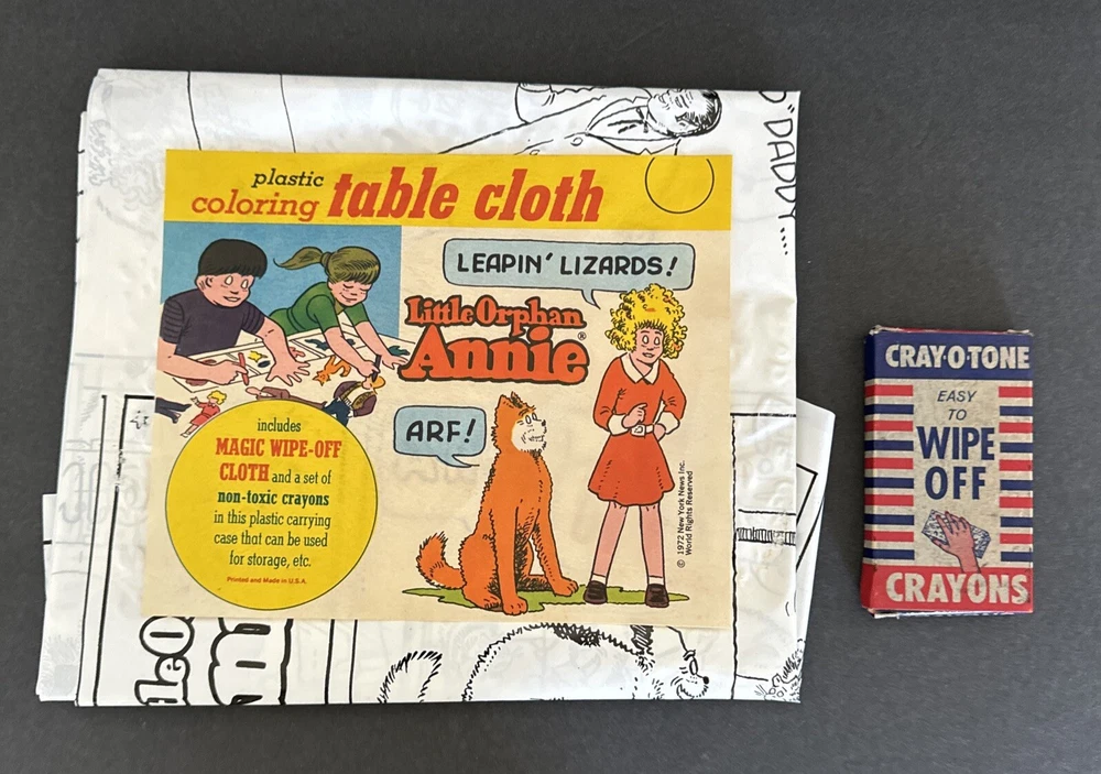 Little Orphan Annie Plastic Coloring Table Cloth w Crayons Easy To Wipe Off 1972. Please see pictures of this lightly used if ever used collectible item. Thanks for visiting !!