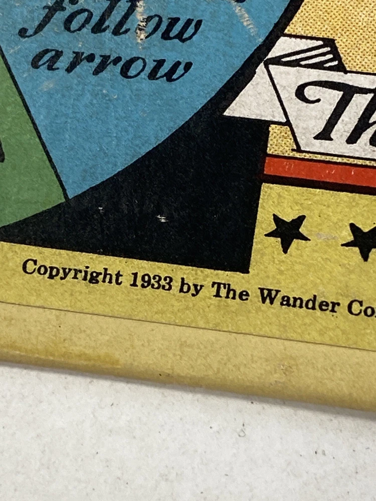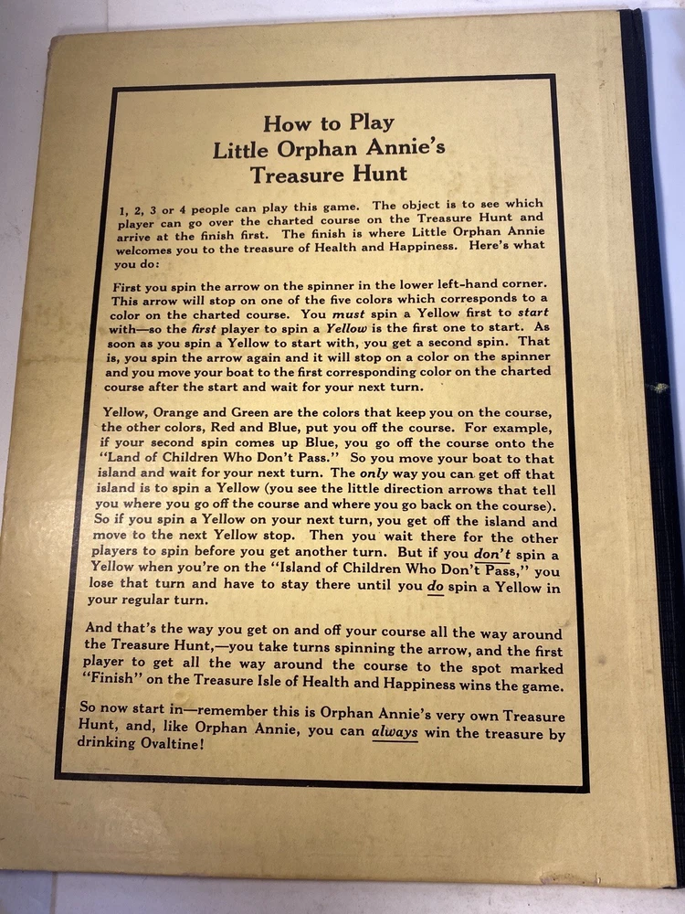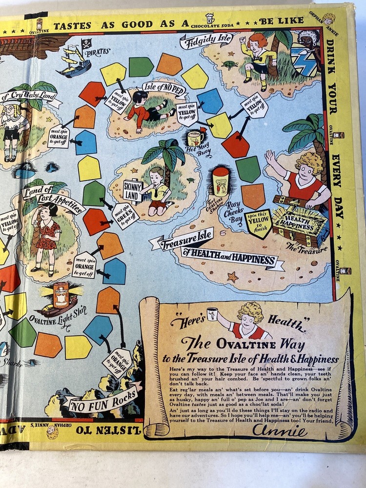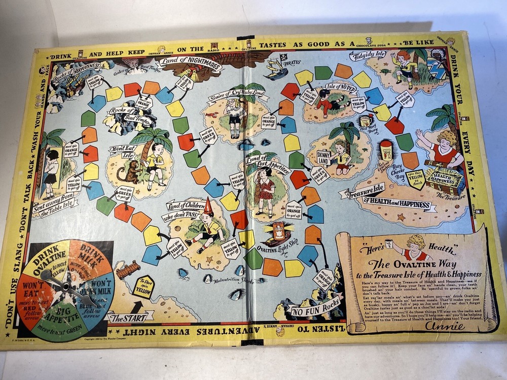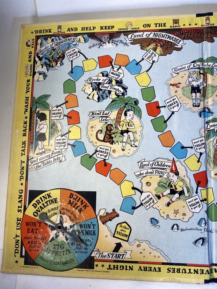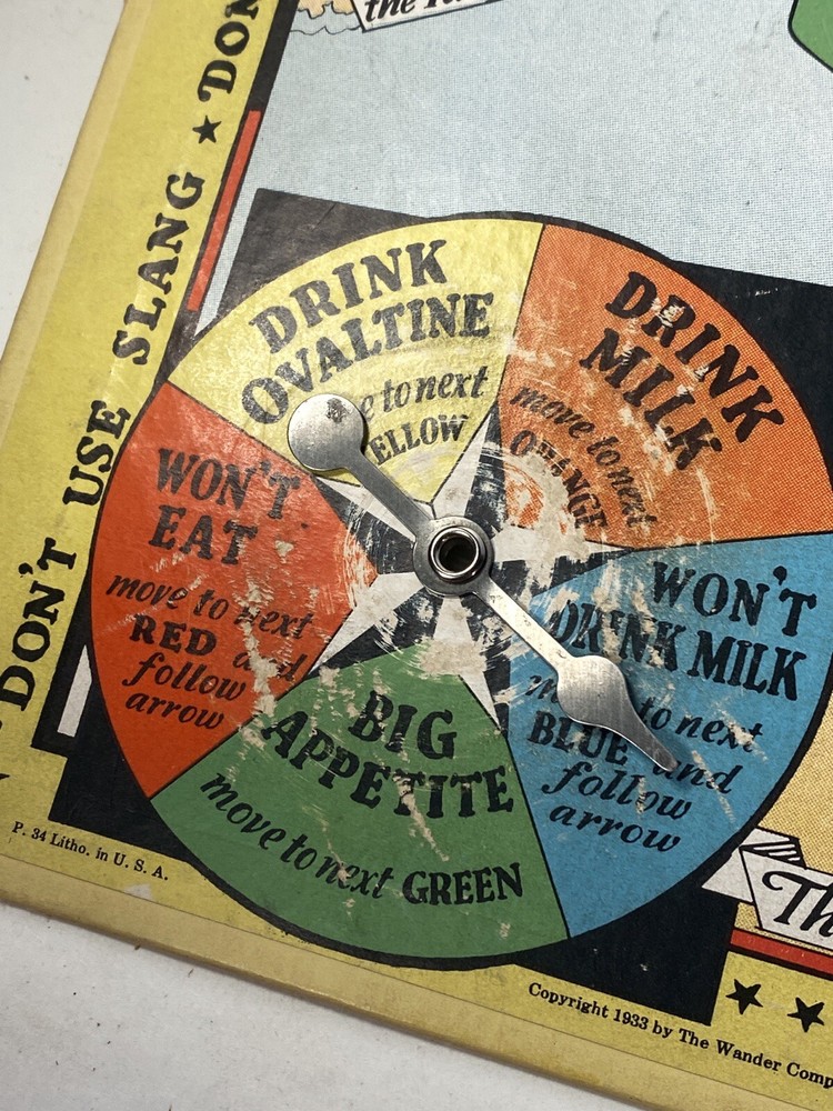 What fun! 1933 when Ovaltine and Orphan Annie were household names. This game board is in good condition. People definitely played the game but were careful overall. The most wear is where the spinner spins. And the spinner still spins smooth with little effort. Evidently there were 4 little boat player pieces. Those are no longer with this board. Any four player pieces should do.