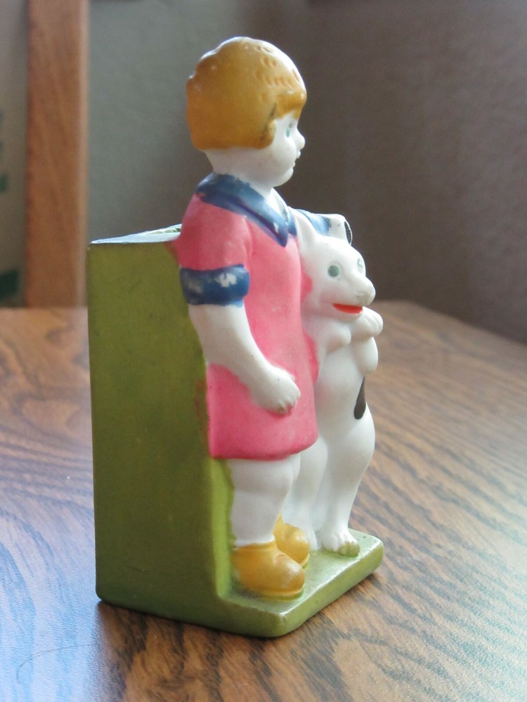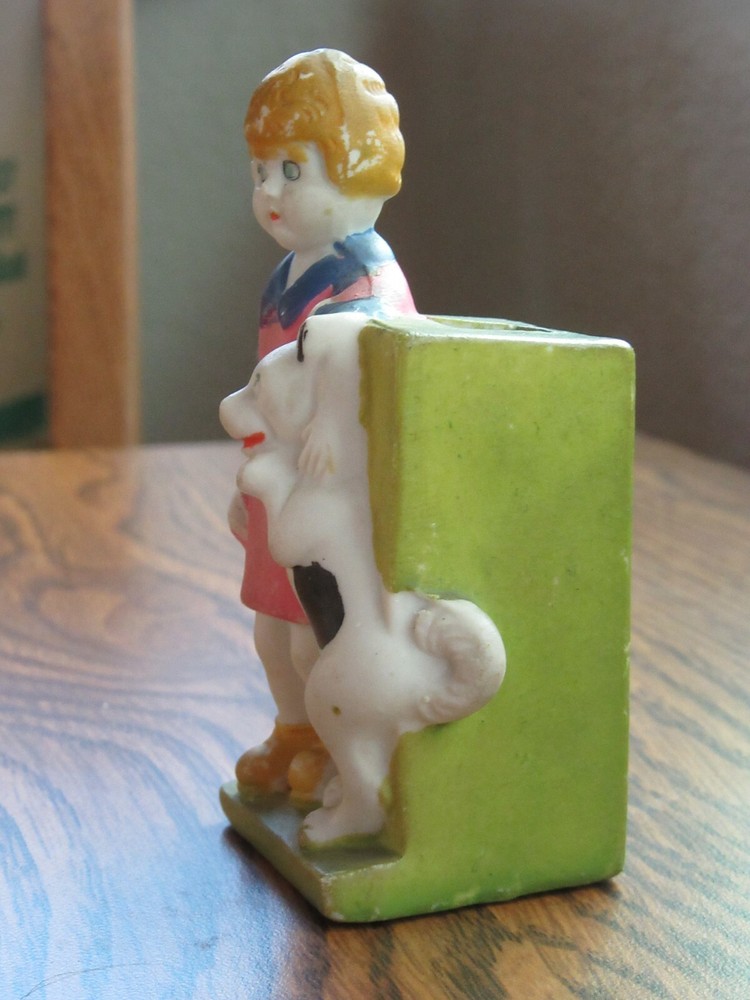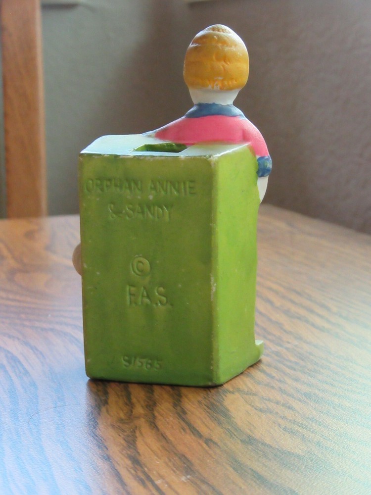 Mid 1930s Little Orphan Annie and Sandy bisque one slot smaller toothbrush holder. Clearly marked on back "Little Orphan Annie and Sandy F.A.S. (Famous Artists Syndicate)". Piece measures approx. 4" inches tall and 2 1/4" inches wide. Paint is about 95%. Slighter darker paint than another one just previously listed. No chips or cracks. Looks great. Please email with questions you might have.