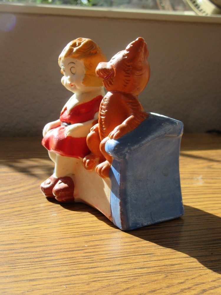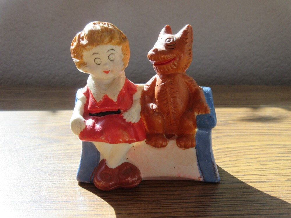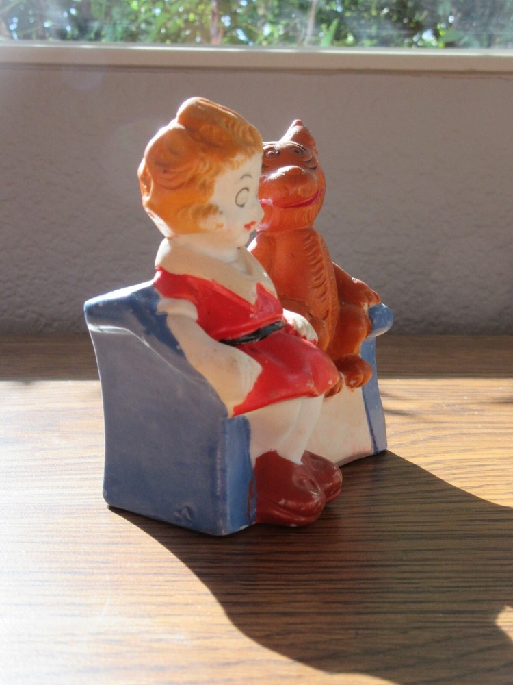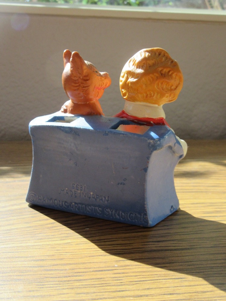 1930s bisque ceramic toothbrush holder depicting Little Orphan Annie and her dog Sandy. Outstanding condition with no issues. Extremely clean paint on this one - about as perfect as you will find. Measures approx 3 1/4" wide by 3 3/4" tall. clearly marked "Famous Artists Syndicate Made in Japan". A great example of this classic toothbrush holder. Please email with any questions you might have.