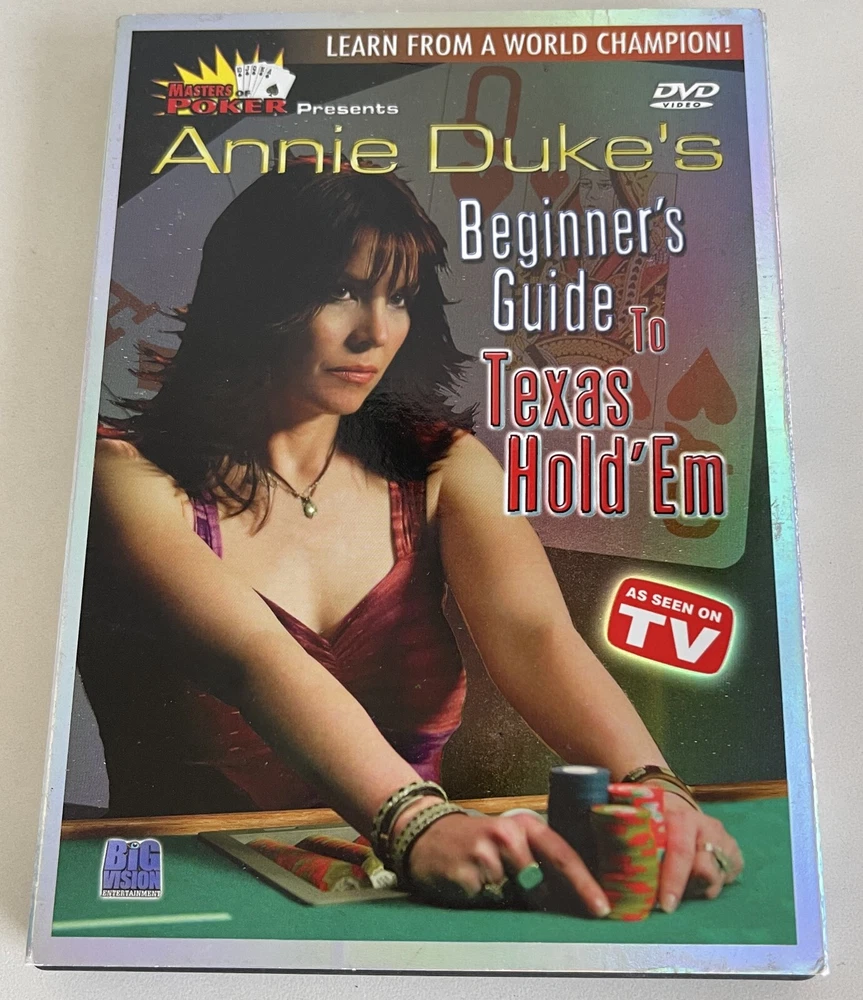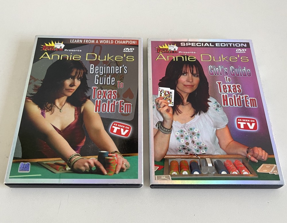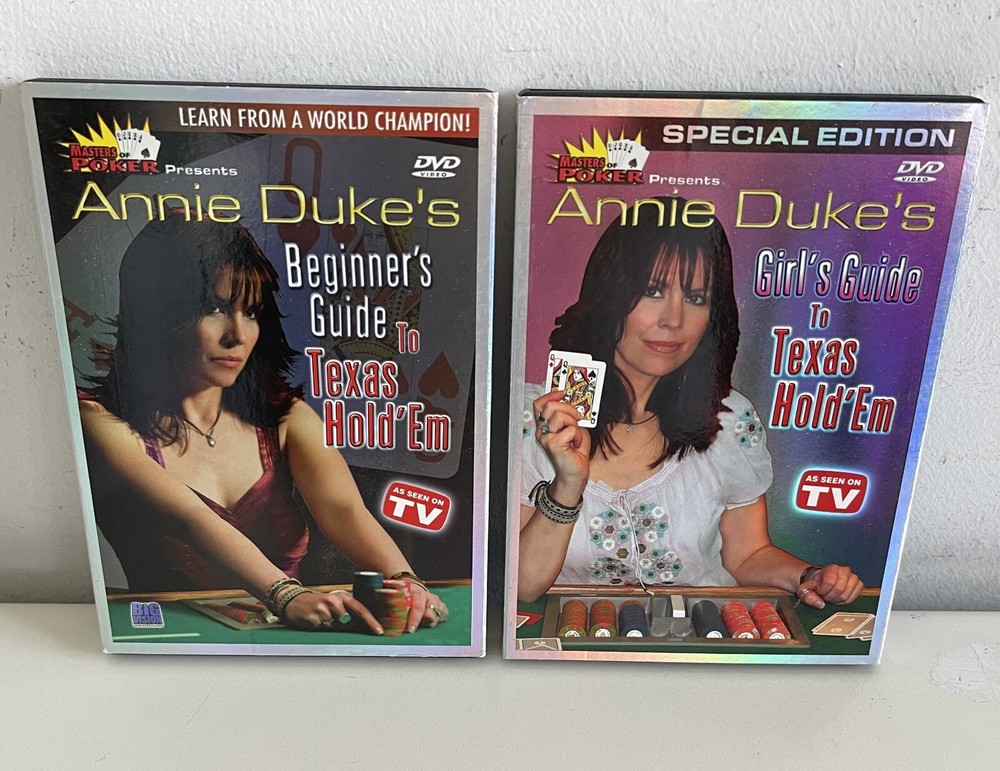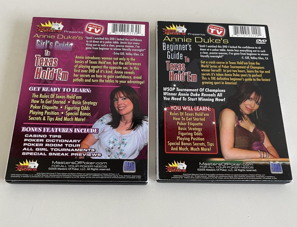 Auction is for 2 DVD In Best of My knowledge, they Are New Masters of Poker: Annie Duke's Girl's Guide to Texas Hold'em Annie Duke's Beginner's Guide to Texas Hold' Em PLEASE SEE THE PICTURES FOR MORE DETAIL MY BEST DESCRIPTON IS THE PICTURES YOU GET WHAT YOU SEE IN THE PICTURES
