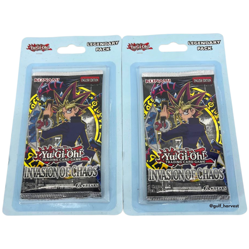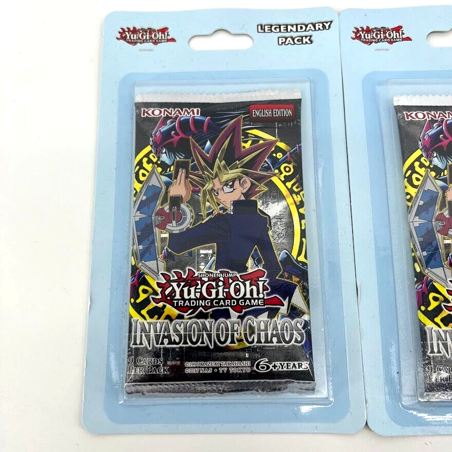 Each pack is new/sealed in a blister pack. This listing is for the lot of 2 packs/blisters pictured. Yugioh Invasion of Chaos Blister Legendary Booster Packs (2017 Unlimited English Editions). Each blister contains 1 booster pack. Each booster pack contains 9 cards. Items ship with First Class via USPS on the next business day. Ships in a sturdy box to protect the items. International shipping is available through eBay's Global Shipping Program. See pictures to view the items.