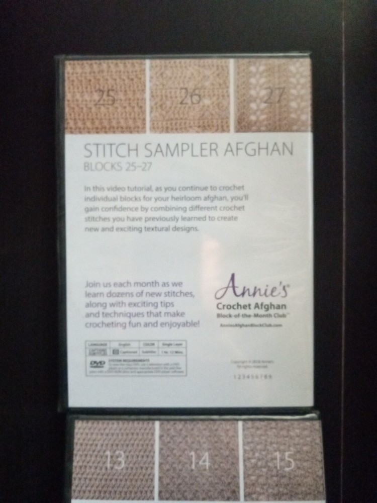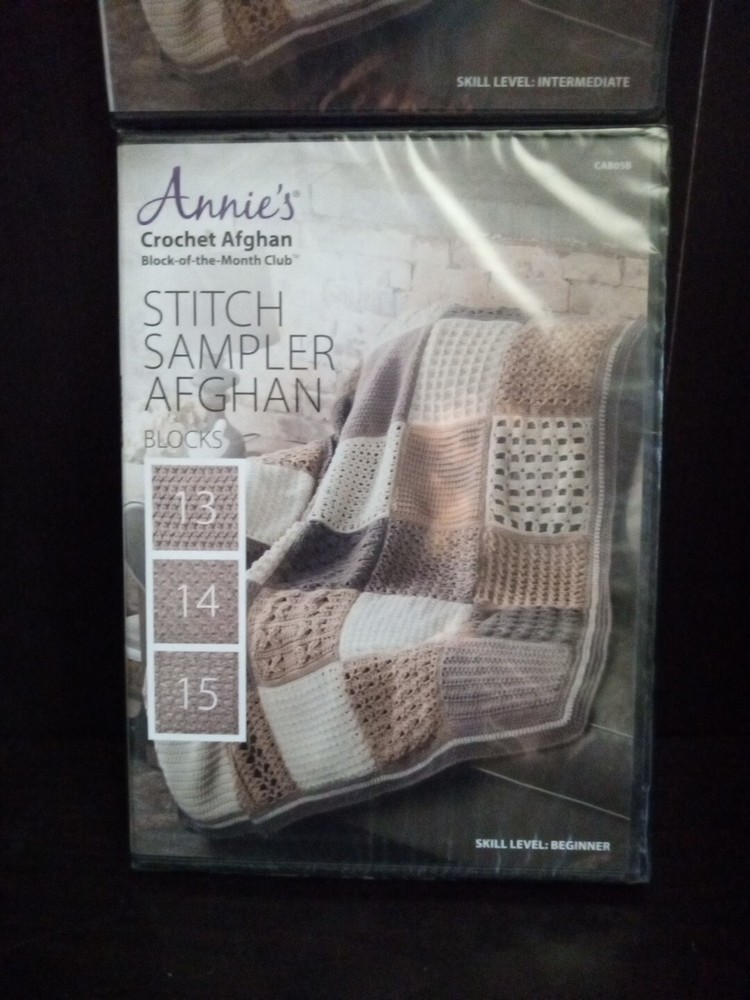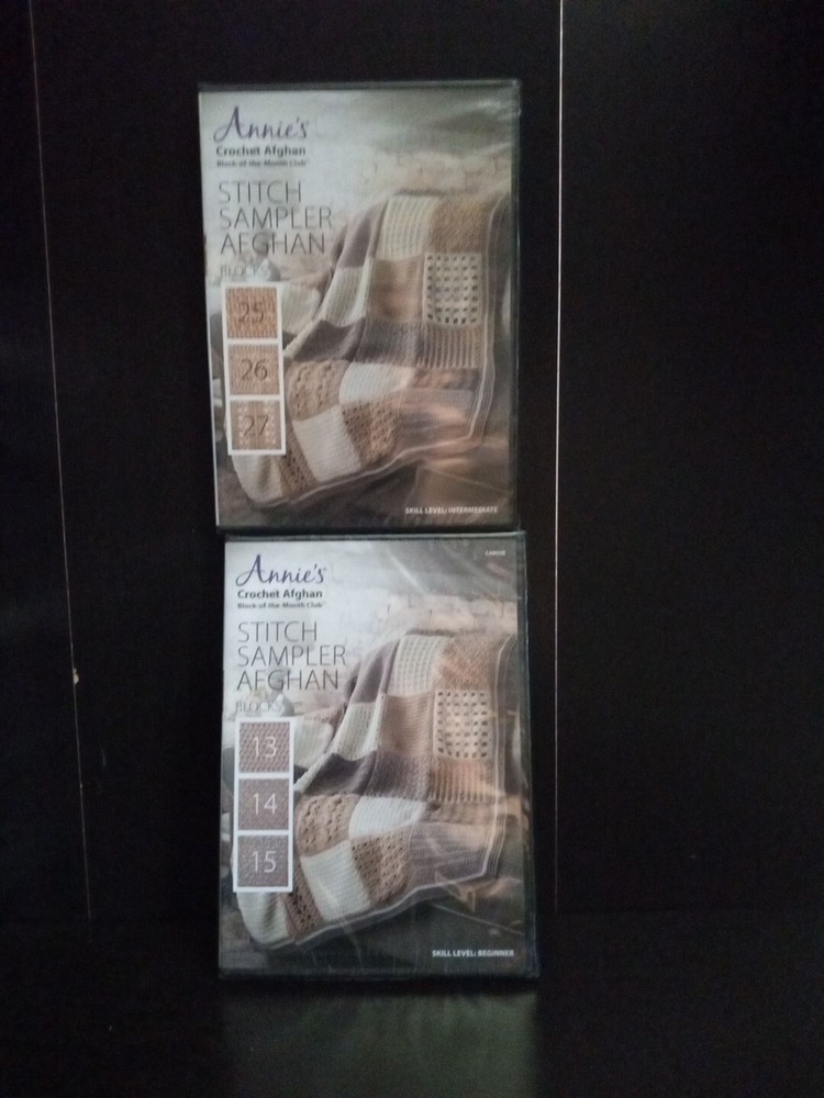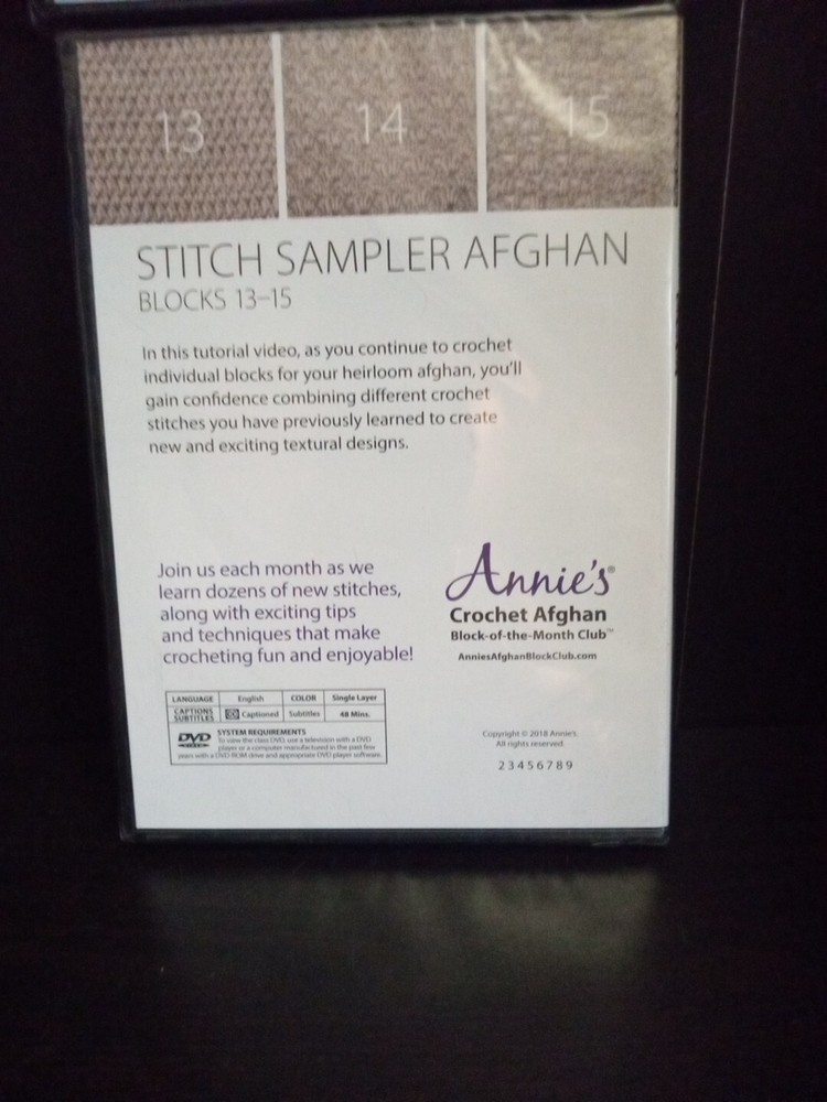 This lot includes 2 DVDs from Annie's Crochet Afghan Block of the Month Club, featuring instructional videos on how to create a beautiful stitch sampler afghan. Perfect for those looking to expand their crochet skills, these DVDs offer step-by-step guidance on creating various stitch patterns and assembling them into a cohesive afghan. The DVDs are specifically formatted for use in DVD players and come in their original packaging. Ideal for anyone interested in learning new crochet techniques or looking for a fun and challenging project, these DVDs are a must-have addition to any crocheter's collection.