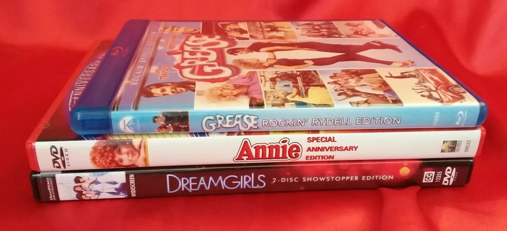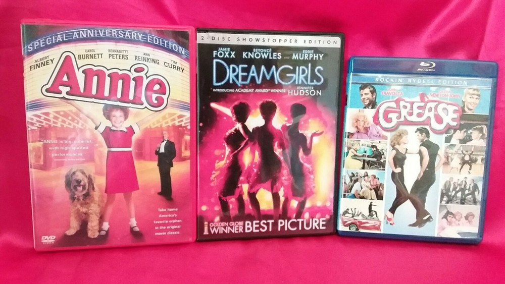 You will recieve: 1- LOT OF 3 MUSICAL'S (Blu-ray/DVD) Annie Dreamgirls Grease Complete with all ORIGINAL INSERTS !!! These are three separate (Blu-ray/DVD) movies with the following titles: Annie Special Anniversary Edition (DVD) Dreamgirls 2-Disc Showstopper Edition (DVD) Grease Rockin' Rydell Edition (Blu-ray) CHECK OUT MY OTHER LISTINGS !!! Resistance is futile !!! SO BUY TODAY !!! All my products are authentic and I strive to be as accurate as possible with my listings, so I do not offer refunds. Payment not received within 7 days of auction close will be reported to Ebay as Unpaid Items. NO INTERNATIONAL SHIPPING--LOWER 48 STATES ONLY…