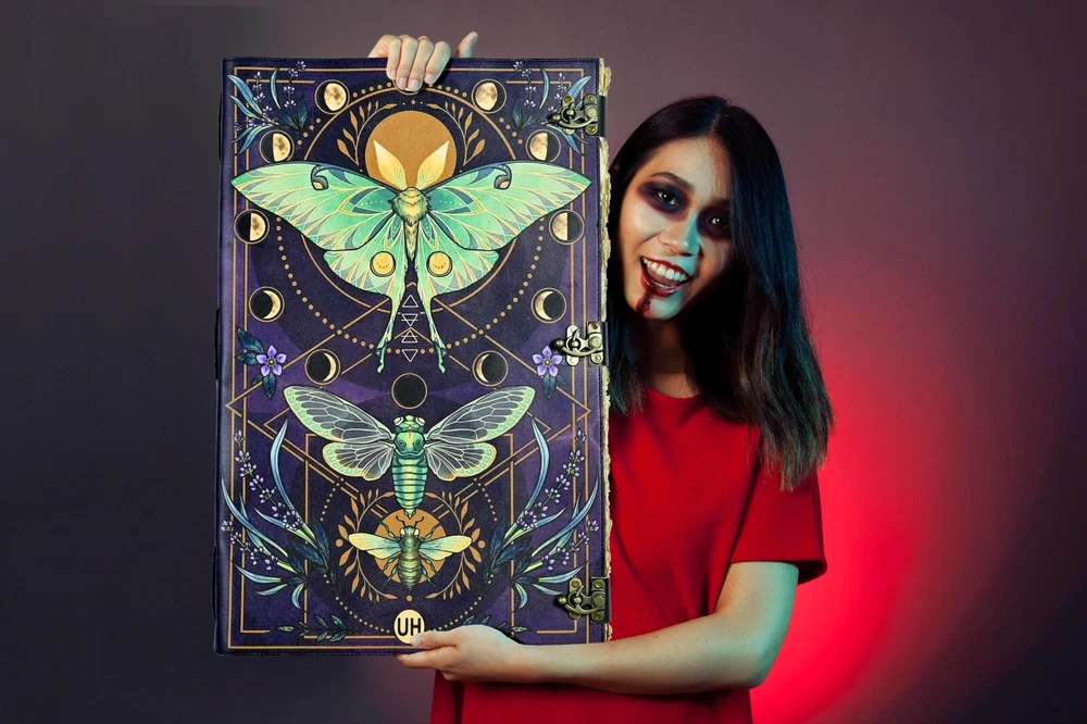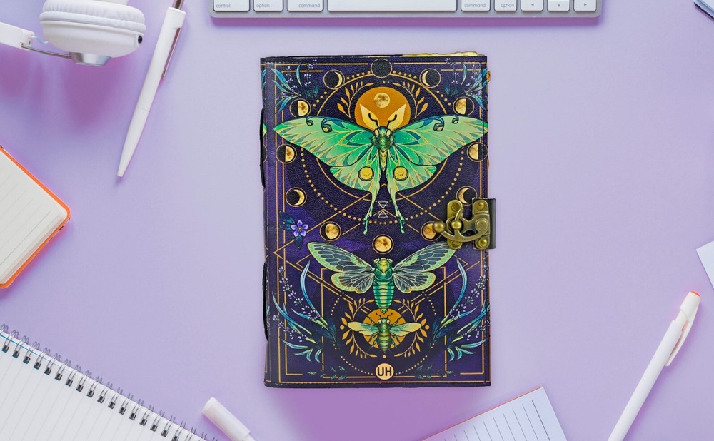 LUNA MOTH - Leather journal witchcraft book of shadows notebook is made with 200 pages of Antique Paper which looks like it was pulled from history. You will fall in love with the the antique handmade cotton paper which is unique to our Vintage Journal Notebook. ● The vintage clasp lock will keep all your valuable writing locked inside. Sturdy hand stitched binding to make sure that no paper comes out loose from your spell notebook. ● Sketch, Doodle, Write on your Leather Blank Spell Journal with a Calligraphy Pen Fountain Pen, Brush Pen, Ball Pen, Acrylic Colours, Watercolor and many more. We guarantee no bleed through. ● Can be used as a notepad, journal, writing notebook, sketch book. 1.25 inch thickness, easy for handwriting, drawing or sketching and compact for carrying in your bag. Ideal for alternative ● Artist Sketchbooks, Photo Album, Traveling Notes, Business Executive, Logbook, Poetry Work, Journalists, Food Planner, Instagram Scrapbook and Bible Journaling. ● Best Gift For Your Companion: A Journal Is Like A Trusted Friend. You Can Use It To Solve Queries, Get Inventive, Or Record Valuable Memories For Them To Last Forever Or You Can Just Use It As A Gift For Your Wife, Son, Or A Daughter Or For Some Enthusiastic Writer In Your Family. Even For Looking For A Miraculous Spell Book Or A D&D Gamer Looking For His Quest Book. ● Perfectly Sized For Multi-Purpose Use: Length 5", Width 1", Height 7" Inches, This Easy To Carry Personal Diary Is Perfect To Use As A Health Journal, Sketchbook, And Poetry Journal. It’S An Ideal Journal Which Records Your Daily Thoughts And Life Lists. And Also Good For Designing, Doodling, Or Calligraphy Of Your Choice.