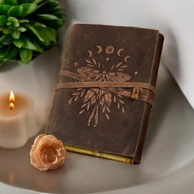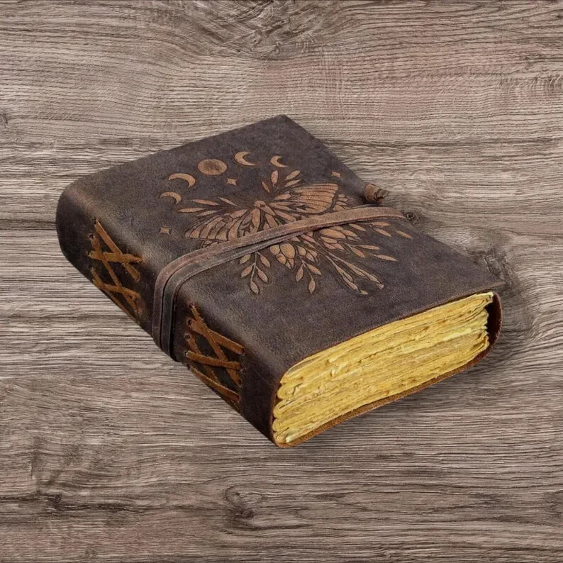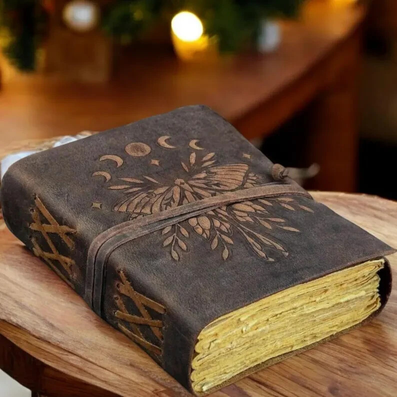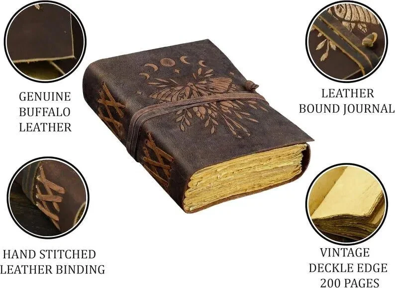 Luna Moth - Vintage leather journal - Handmade Deckle Edge Paper leather bound Journal - book of shadows - sketchbook Drawing Journal Luna Moth leather journal leather journal HAS BEEN THROUGHOUT SANITIZED Beautifully Soft and Durable Top Grain Leather Coptic binding means the pages stay firmly in place A lovely distressed vintage style with a gorgeous, real leather scent handmade leather naturally tanned with oil 200 Pages of Thick Antique Vintage Cotton Deckle Paper which looks like thousand years old. A BEAUTIFUL leather journal OF THE HIGHEST QUALITY The leather Key journal made from antique paper is a treasure that you can pass down the generations. vintage journals grimoire Bound leather book of shadows journal blank spell notebook black the garden flower uncharted merchandise deckle edge paper wiccan sketchbook for women is very beautifully embossed and hand made 100 leaves 200 pages notebook features a green leather binding with embossed designs on both front and back Handmade Deckle Edge Old Vintage Paper Hand crafted Paper using Old Style Cotton Paper , perfectly complementing the black leather Tree-free and Acid-free means you purchasing a product that not harmful A perfect size 200 both side pages journal, not too bulky, easy to write in from the very first page Easy to write in and draw on, use any fountain pens or different colors without worrying about bleed through..