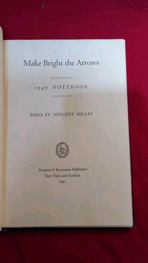 This vintage notebook from 1940 by Edna St Vincent Millay is a must-have for any literature enthusiast. The leather binding adds a touch of elegance to this 1st edition copy of "Make Bright the Arrows". Written in English, this piece is a true gem for collectors and fans of the author. Published by Harper & Brothers, this notebook is a rare find and perfect addition to any book collection. It's a great opportunity to own a piece of literature history. The topic and subject of this notebook are literature and fiction, making it a valuable item for anyone interested in these fields. Don't miss out on this chance to own a piece of history! The first page has previous owner name and this book belongs to sticker MAKE BRIGHT THE ARROWS Notebook (1940) Edna St Vincent Millay Greenwich Village. Shipped with USPS Media Mail.