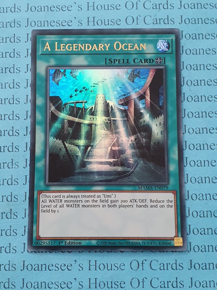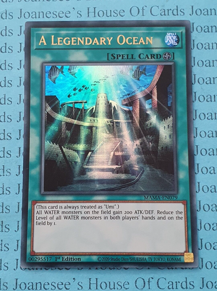 This is an Ultra Rare Foil Spell A Legendary Ocean MAMA-EN079 1st Edition English Mint/NMint Condition Totally Original Konami (or your money back!) I will deliver in safe packaging to keep it in perfect condition. Ideal for players and collectors alike. Check out my other items! I will combine postage costs for multiple purchases. Sign up for my email newsletters by adding my eBay Shop to your favourites