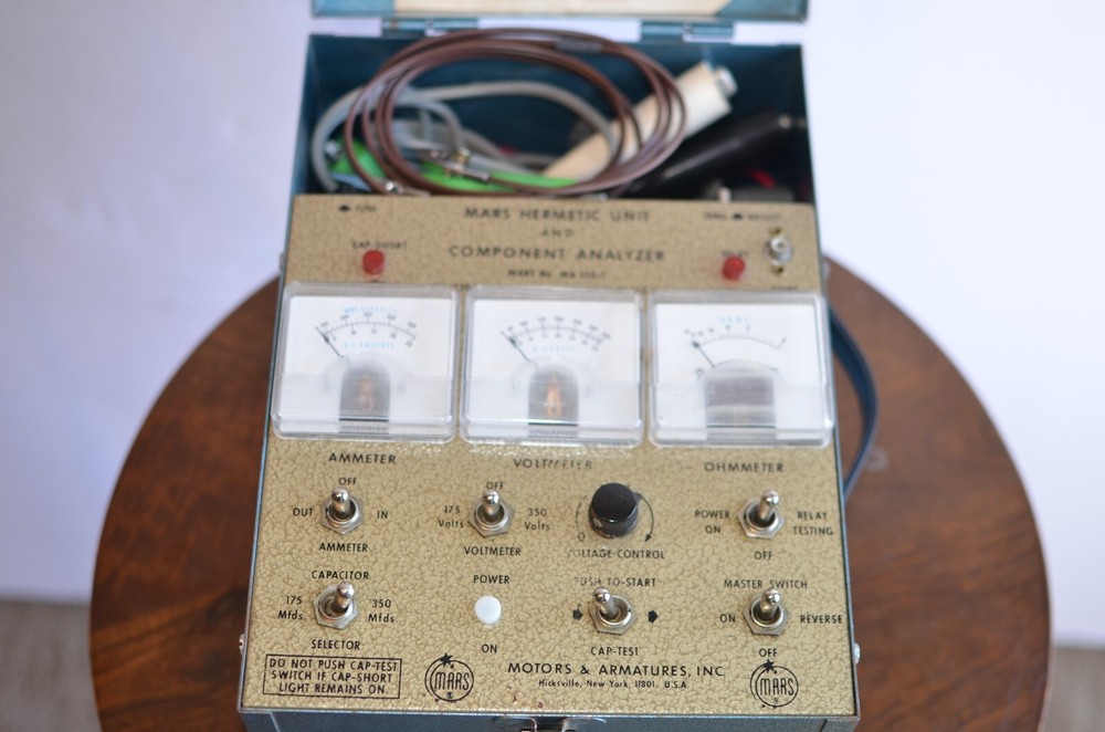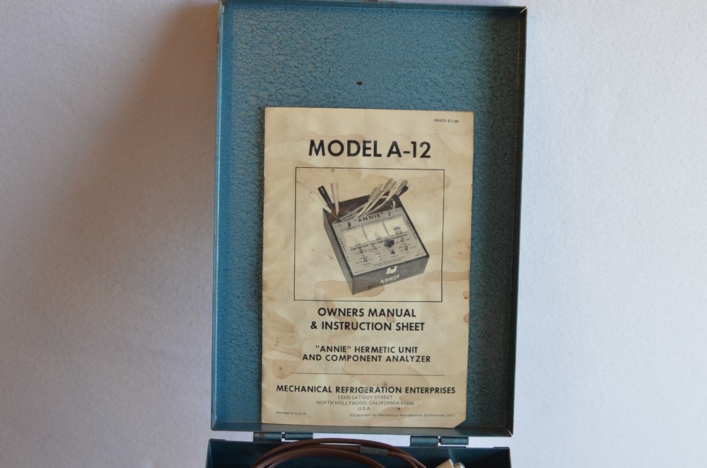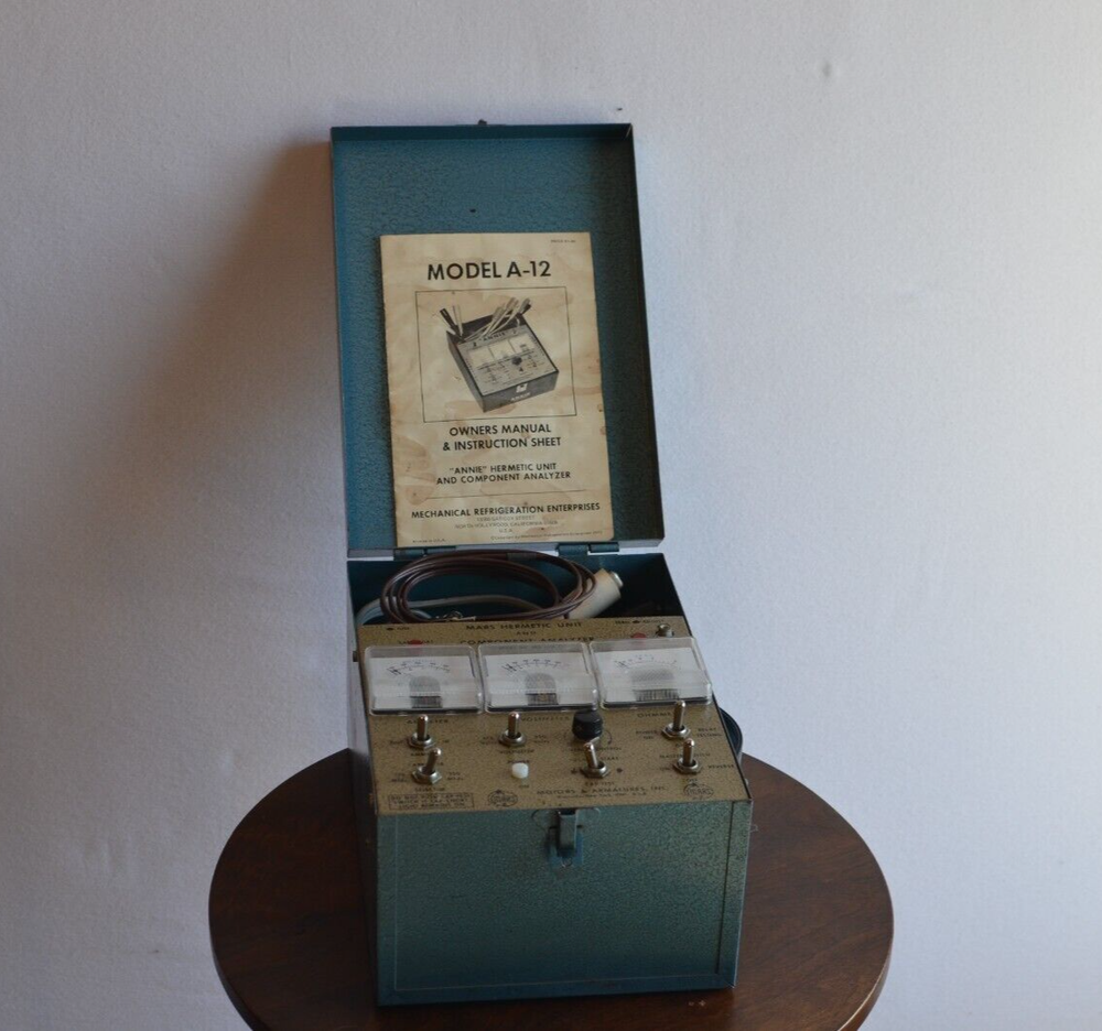 Experience precision analysis with the Mars "Annie" Model A-12 Hermetic Unit & Component Analyzer similar to Imperial Eastman. Designed for imperial measurements, this unit is a staple for professionals in the HVAC and refrigeration industry, ensuring accurate diagnostics and maintenance of hermetic units and components. Crafted in the United States, the Model A-12 is a singularly focused instrument, tailored to deliver reliable results with each use. Whether for installation or repair, the analyzer's straightforward operation and robust construction make it an essential tool for technicians and engineers alike. Comes with Metal Case. Unit powers on and knobs, switches and gauges are responsive but has not been tested so selling "As Is."