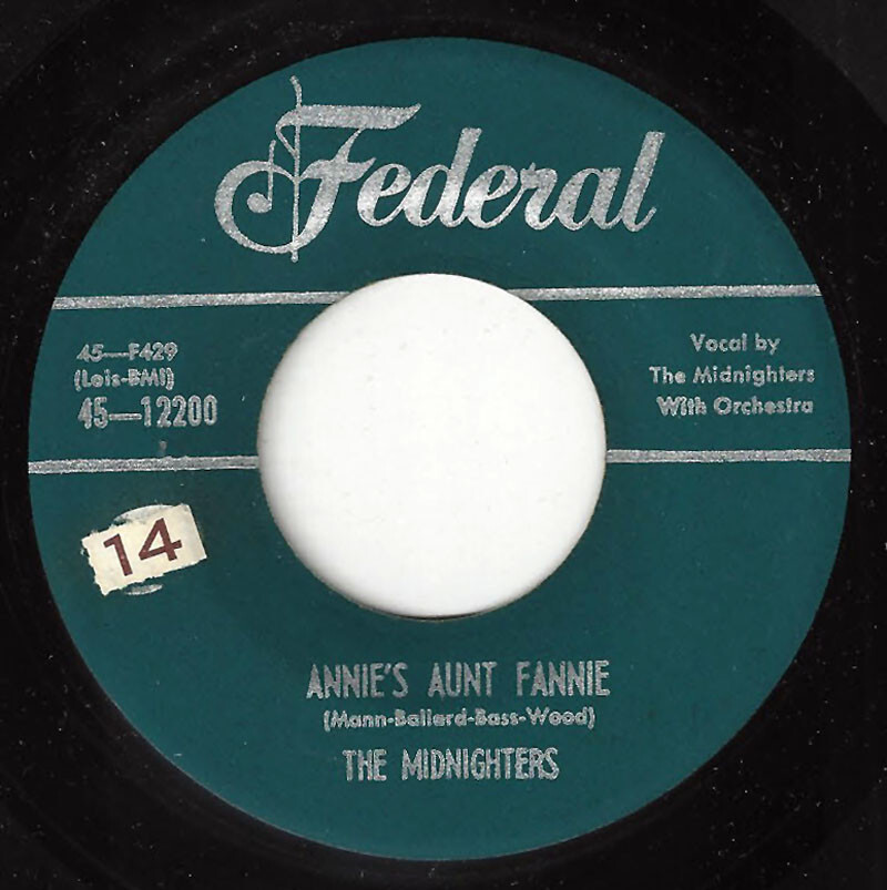 Midnighters "Annie's Aunt Fannie"/"Crazy Loving (Stay With Me)" on Federal 12200 released in 1954. Record is in VG condition. Labels have sticker on A side, see photos. PLEASE WAIT TO RECEIVE INVOICE BEFORE SENDING PAYMENT! U.S.A.: 45's $4.75 first class mail. Priority on request by zone. Delivery confirmation included. Delivery address must be verified by Paypal. We are not responsible for uninsured packages. Overseas: Over $50 by Priority International OR registered mail and over $100 Global Express only as Paypal requires tracking and signature. OVERSEAS CUSTOMERS: While we value your business we can not be responsible for any delays in delivery due to mail service or customs procedures or delays. Any fees, duties, tariffs or other monies due are the responsibility of the buyer and not included in any winning bid or postage. It is your responsibility to know in advance of bidding any impact these may have. Please do not ask us to falsify customs values. S/S Still Sealed: Unopened in original packaging M- Mint minus: Nearly flawless in condition and play. The highest grade I use. VG++ Very Good Plus Plus: A few light scuffs/marks, retains full gloss and plays nearly perfectly. VG+ Very Good Plus: Light surface wear, marks may sound occasionally but not adversely affect play. Should be very acceptable to most collectors. VG Very Good: Moderate surface wear, obviously played will have noise but not to distraction. VG- Very Good Minus: Well worn. Constant noise, clicks & pops but does not overwhelm music. G Good: Clicks, pops & noise compete with music. Good for filler on hard to find records. All items packed securely in custom mailers. Lp's are removed from covers for shipping. Payment by: PAYPAL. All payments must be in U.S. funds. ******Please ask any questions you may have BEFORE bidding.****** Satisfaction guaranteed . (Limited to purchase price and postage). While we make every effort to carefully grade records mistakes can happen - even new records can be defective. If you encounter a problem kindly e-mail us so we can make it right.