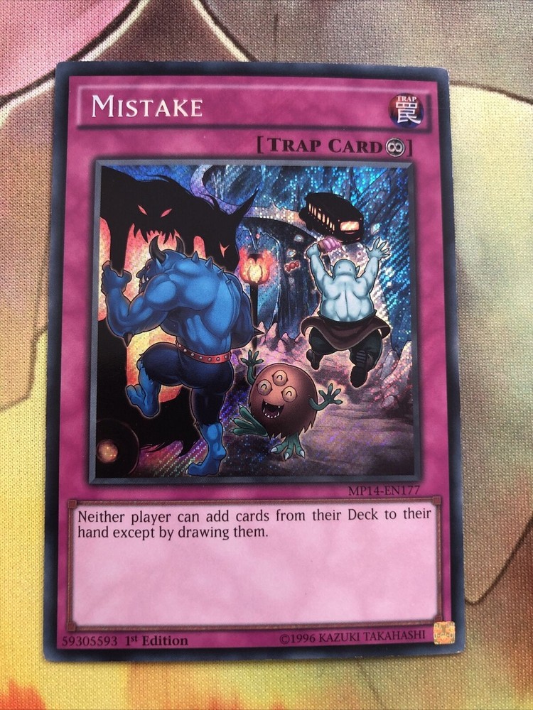 You are bidding on : 1 x Yu-Gi-Oh MISTAKE (Secret Rare - 1st Edition) MP14-EN177 In stock and ready to ship All cards are in Near Mint condition unless specified Pictures are stock pictures ONLY it is not of the actual card How we identify the condition of the card: Near Mint: Most of the time cards in this condition are pack fresh but, the card may have minor flaws that are not visible with a quick inspection, small white dots or scratches that you have to closely examine the card to see. Excellent: Overall the card looks near mint but may have minor scratches, slightly worn edges that are visible but they do not interfere with the way the card looks. Lightly Played: Similar to a card in excellent condition except there is more whitening around the edges and the corners are a little more worn or slight bends or creases that are visible. There might be some slight whitening on the back or front of the card. Imperfections will be visible with a quick inspection. When the card is sleeved the imperfections will not be noticeable and the card will look just like the rest of your cards Played: There is a large amount of whitening around the edges and the corners have a good amount of damage, many scratches, bends and/or creases on the card. When the card is sleeved it can still be played Shipping and Handling : Canada Shipping is $1.50 Tracking is offered for $13 CAD BUT tracking is required on any purchases that are over $50 CAD Please contact us for combined shipping if interested in purchasing multiple cards before paying USA Shipping is $1.99 CAD Regular Mail for all orders under $19.99 Shipping is $7.99 CAD with tracking for all orders $19.99 and over Please contact us for combined shipping if interested in purchasing multiple cards before paying INTERNATIONAL Shipping is $4.99 CAD with regular mail Tracking is offered for $29.99 CAD BUT tracking is required for purchases over $50 CAD Please contact us for combined shipping if interested in purchasing multiple cards before you pay Combined shipping: We offer combined shipping: each and every additional item after the first one is only $0.25 (25 cents). To obtain combined shipping fees, please use the shopping cart or ask for the combined shipping invoice BEFORE you pay. If you pay item-by-item, right away after the purchase, we will not be able to offer you combined shipping anymore. Handling Your order will be shipped 1-3 business days after payment has been received *“Business days” are normal weekdays. Saturdays, Sundays, and major holidays do not count as business days. Cards purchased are packaged and shipped in a sleeve, toploaders, a team bag and an envelope to ensure protection of cards Payment : We accept payment via PayPal only. Payments should be made within 5 days after purchase Epic Cards and Games Any questions feel free to email us and allow 1 day for a response. Thanks for looking! Sales Tax (Canada Only) : Purchases made by Canadian residents are subject to applicable GST/HST, depending on your province/territory. (If you do not agree to this, please do not bid. We have a registered business in Canada and are required by law to charge taxes to anything shipped within the country.) Thank you for shopping with Epic Cards and Games