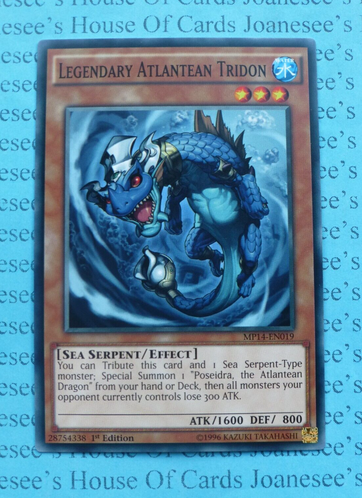 This is the Common Water Sea Serpent Legendary Atlantean Tridon MP14-EN019 1st Edition English Mint/NMint Condition Totally Original Konami (or your money back!) I will deliver in safe packaging to keep it in perfect condition. Ideal for players and collectors alike. Check out my other items! I will combine postage costs for multiple purchases. Sign up for my email newsletters by adding my eBay Shop to your favourites