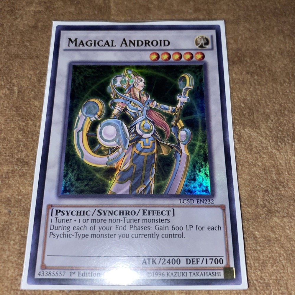 The product is a Magical Android card from the Yu-Gi-Oh! trading card game, specifically from the Legendary Collection 5D's Mega Pack set. It is classified as an ultra rare card manufactured by Konami, with a 1st edition print run. The card number is LC5D-EN232. This collectible card is sought after by players for its unique abilities and rarity in the game.