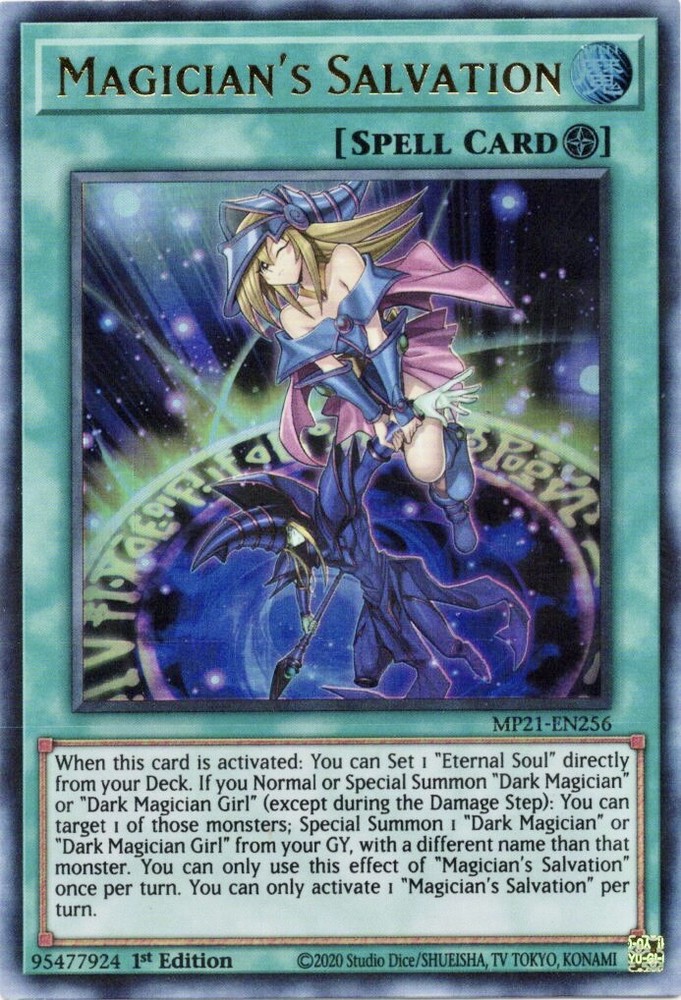 This card is a highly sought-after ultra rare 1st edition near mint YuGiOh item. Its stunning holographic finish pops against the dark background of the card stock material. The card features the character of Yami Yugi and Yugi Muto in their spellcaster forms, known as Magician's Salvation. The card is a Spell-Field type with the card number MP21-EN256 and belongs to the 2021 TIN OF ANCIENT BATTLES - MEGA TIN set. It is a great addition to any Yu-Gi-Oh! TCG collection. The card is in excellent condition and ready for play.