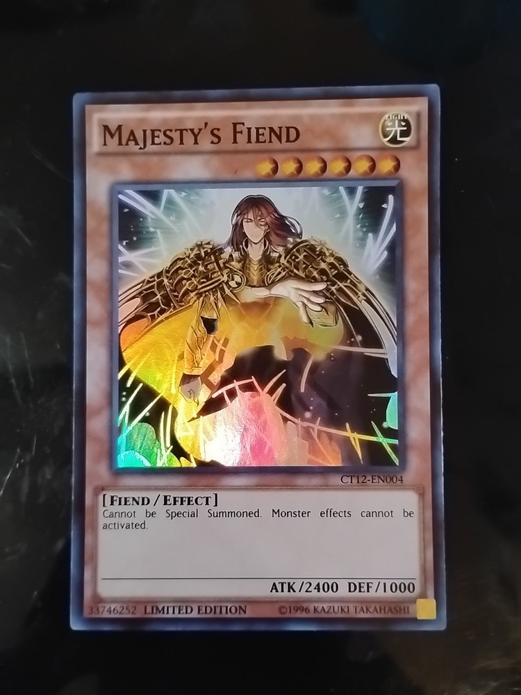 The Majesty's Fiend CT12-EN004 2015 Mega-Tins Limited Edition card is a highly sought-after collectible in the Yu-Gi-Oh! TCG. Manufactured by Konami, this Super Rare card features a Light Fiend-type creature with impressive stats, including 1000 defense and 2400 attack power. Its limited edition status and unique attributes make it a valuable addition to any card collection. With its English language text and special features, this card is a must-have for fans and collectors alike.