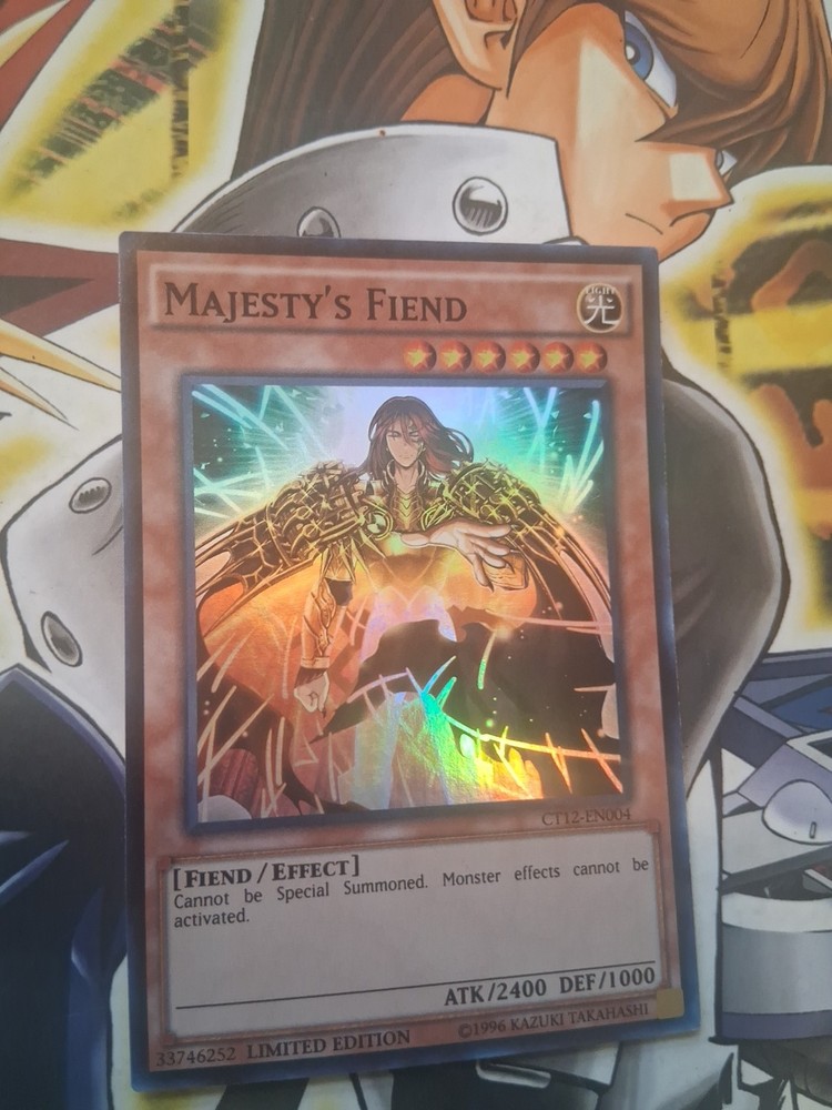 This is a rare and powerful card from the Yu-Gi-Oh! TCG called Majesty's Fiend. It is a limited edition card from the 2015 Mega-Tins set, with the card number CT12-EN004. This card has an attack power of 2400 and a defense toughness of 1000. It is an effect card with a light attribute and is a type of fiend monster. The card is in English and was manufactured by Konami.