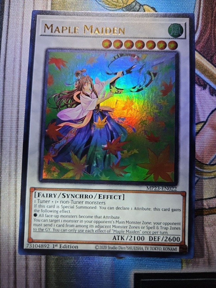 Maple Maiden MP23-EN022 is a highly sought-after card from the 25th Anniversary Tin: Dueling Heroes Mega Pack. This Ultra Rare card is a Synchro, Effect type card with a powerful attack and defense of 2100 and 2600 respectively. It is a 1st Edition card and is written in English. Maple Maiden is a Fairy type creature and has the card number MP23-EN022. This card is perfect for any Yu-Gi-Oh! TCG collector or player.