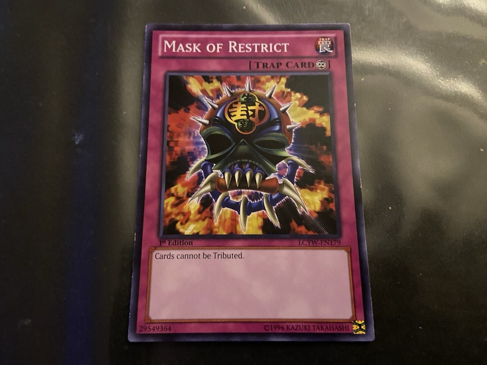 Elevate your Yu-Gi-Oh! TCG gameplay with the Mask of Restrict from the Legendary Collection 3: Yugi's World set. As a Common card with the card number LCYW-EN179, it's a staple for players looking to enhance their Trap line. The English language card features the 1st Edition mark, indicating its uniqueness within the set. Manufactured in the United States by Konami, this Trap-Continuous card maintains the standard card size with a regular finish, ensuring a sleek addition to any deck or display. Whether for competitive play or collecting, the Mask of Restrict is a strategic asset for any Yu-Gi-Oh! enthusiast.