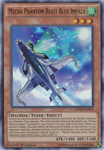 Mecha Phantom Beast Blue Impala - MP14-EN076 - Ultra Rare - 1st Edition Image is a stock photo of the card. You will receive the card in Moderately Played condition Condition: Moderately Played ATK/DEF : 1400/1100 Attribute : Wind Card Number : MP14-EN076 Card Rules : Card Text : Cannot be used as a Synchro Material Monster, except for the Synchro Summon of a Machine-Type monster. The other Synchro Material Monster(s) are "Mecha Phantom Beast" monsters in your hand or on your side of the field. While you control a Token, this card cannot be destroyed by battle or card effects. If your opponent controls a monster and you control no monsters: You can banish this card from your Graveyard; Special Summon 1 "Mecha Phantom Beast Token" (Machine-Type/WIND/Level 3/ATK 0/DEF 0). Card Type : Tuner Monster Edition : 1st Level : 3 Monster Type : Machine Name : Mecha Phantom Beast Blue Impala Passcode : 67489919 Pendulum Scale : Rarity : Ultra Rare Set : Mega Pack 2014 Be sure to visit our store for a wide selection of your favorite cards! We are running specials RIGHT NOW!! Shipping Options: ~Ships in a regular white envelope with a stamp for FREE! (THERE IS NO TRACKING INFORMATION AVAILABLE FOR THE ABOVE METHOD. SHIPPING TIME IS 4-10 BUSINESS DAYS) ~Shipments are handled same or next business day. ~ FREE SHIPPING for each additional card, so shop around our store!