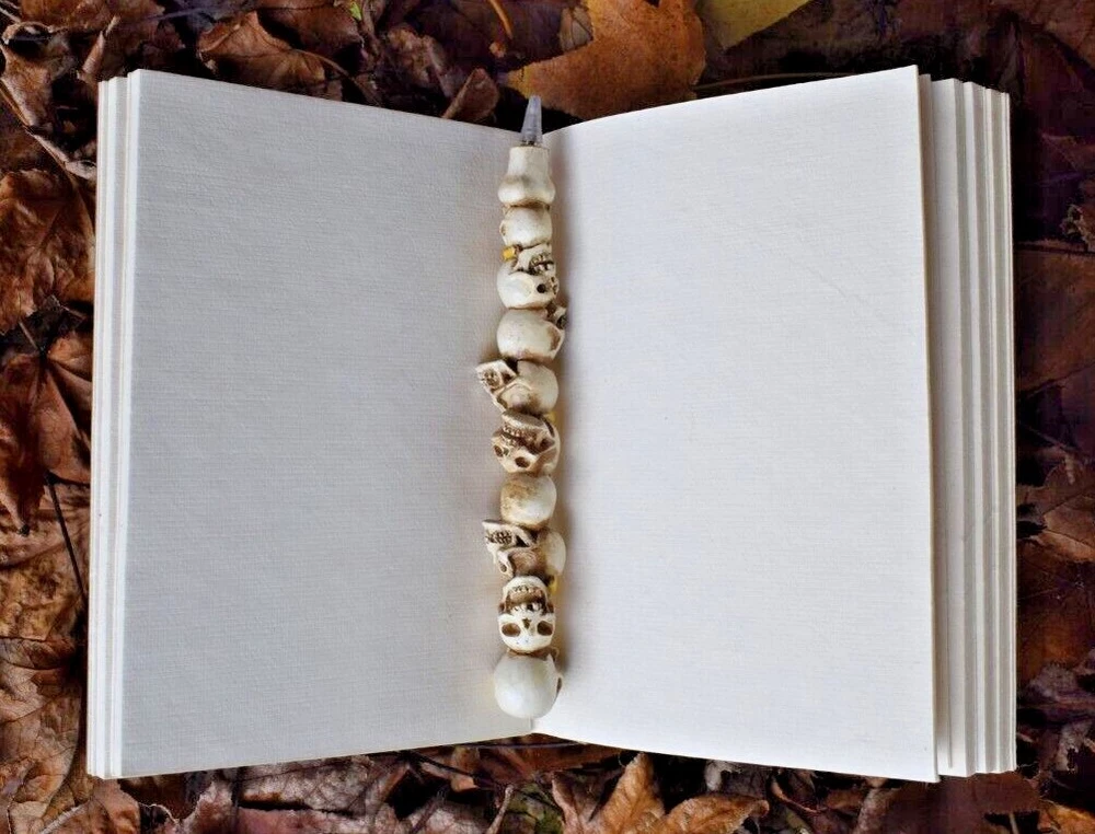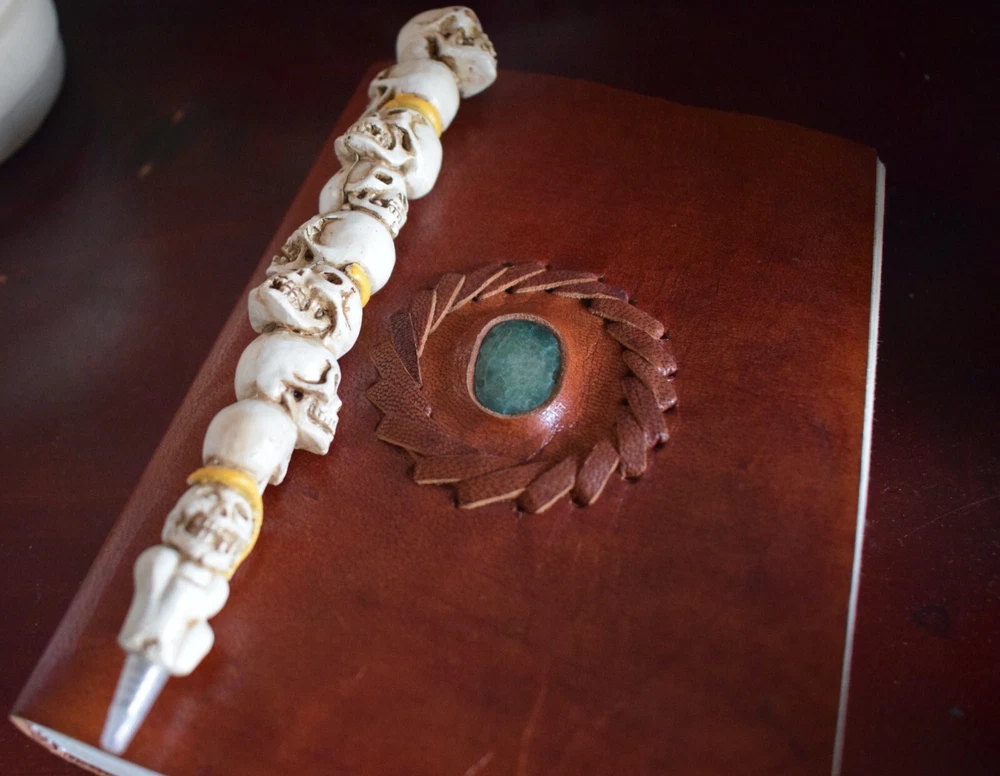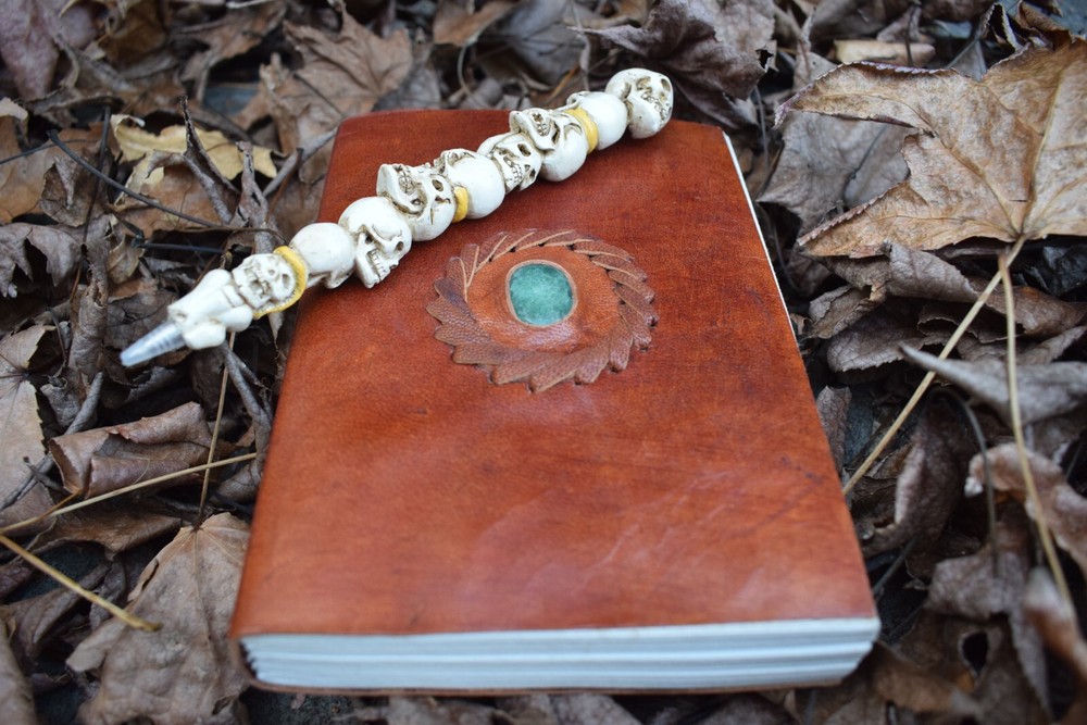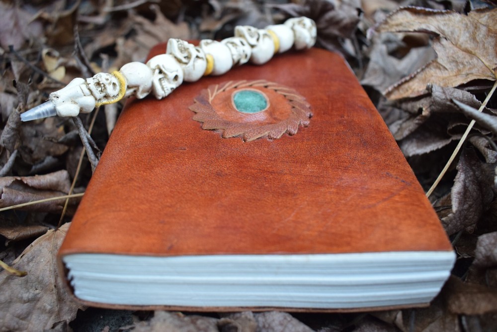 The beautiful crystal on this leather-bound 18 x 13cm book is aventurine. Aventurine is known for enhancing creativity, leadership, vitality and happiness. The name aventurine comes from the Italian "aventura" meaning "by chance" because it's worn by gamblers to break through beliefs and obstacles that restrict the flow of money. Aventurine bestows luck on its owner and grounds prosperity and manifestations into the physical plane. Aventurine is an energy-amplifying stone that assists in making you aware of how you use your energy so you can focus on what you want to create. This can be very helpful embedded into a grimoire as it can guide you with your writing and inspiration. The genuine, pure leather that covers this book also has magickal symbolism. Leather is connected with protection and healing. It symbolises the strength and guarding of valuables, making this book the ultimate witch's diary. This crystal book of shadows journal is leather-bound, thick 100% recycled handmade paper. Made in India. Beautiful blank pages for you you to write your spells, chants, meditations and dreams. Perfect for art magic, a grimoire or a book of shadows. This is an essential Witch tool. Enjoy! Why have your Grimoire Blessed? Blessing by our P riestesses is optional. Blessing includes the infusion of our mantra "Always to help. Never to harm", anointed with Moon water and sacred essential oils charged by the elements. This blessing means your grimoire is no longer an ordinary item. The Beckoning Broom P riestesses' magic breathes life into the grimoire transforming it into a powerful tool. With our blessing, the grimoire will be significantly more potent for anyone using the grimoire. Our blessing gives it power and divinity of its own. Your Grimoire Details Size of Grimoire: Height: 18cm (7") Width: 13cm (5") Depth: 3cm (1") Contains: 1 Leather-bound Grimoire