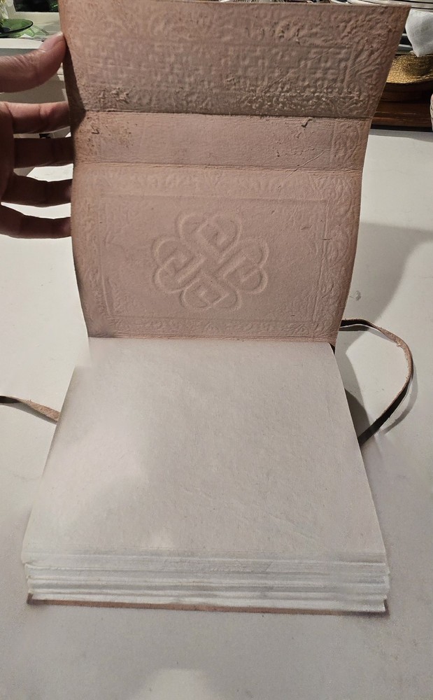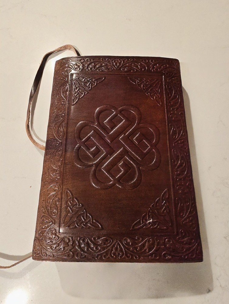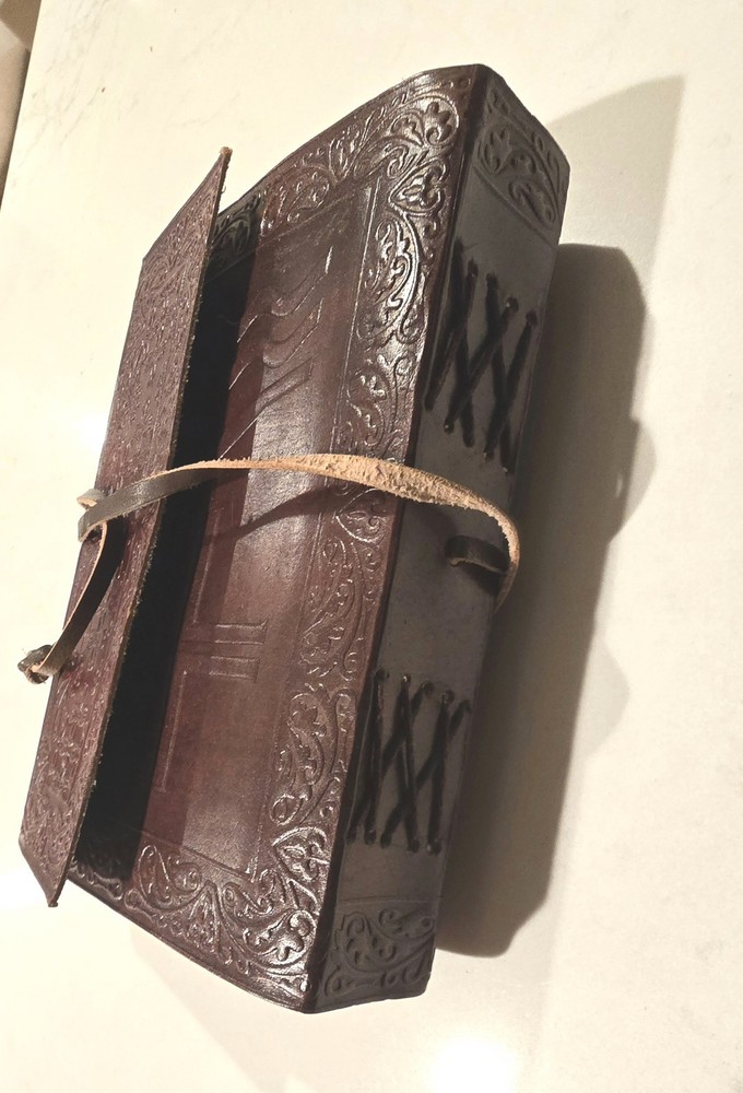 The Medieval Renaissance Leather Bound Diary is a handmade journal notebook with a genuine cowhide leather cover featuring a flower and diamond design. The diary is approximately 6.3 inches in length and 4.7 inches in overall width, with about 110 sheets of handmade fiber and recycled biomass paper. It includes special attributes such as a threaded cover tie and bookmark, making it a unique and aesthetically pleasing option for those looking for a personalized diary to jot down notes or thoughts. Made in the United States by Armory Replicas, this luxurious diary is perfect for those who appreciate vintage and historically-inspired items.