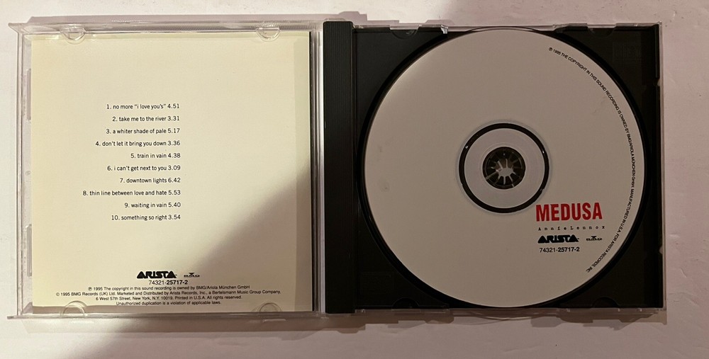 This CD features the iconic album "Medusa" by Annie Lennox, released in 1995 by IMT and RCA. The disc grading is Very Good (VG) and comes in a standard jewel case. The inlay and case conditions are also Very Good (VG). This album is a must-have for any rock music fan and includes great covers. Get your hands on this classic CD today! Very good condition for CD and inserts. Clear plastic jewel case may have some sticker residue and typical scuffing and may have some cracks in the case. CD may have some light surface scratches that do not affect playback. Please inspect photos for the best representation of condition. Please check out my other great items!