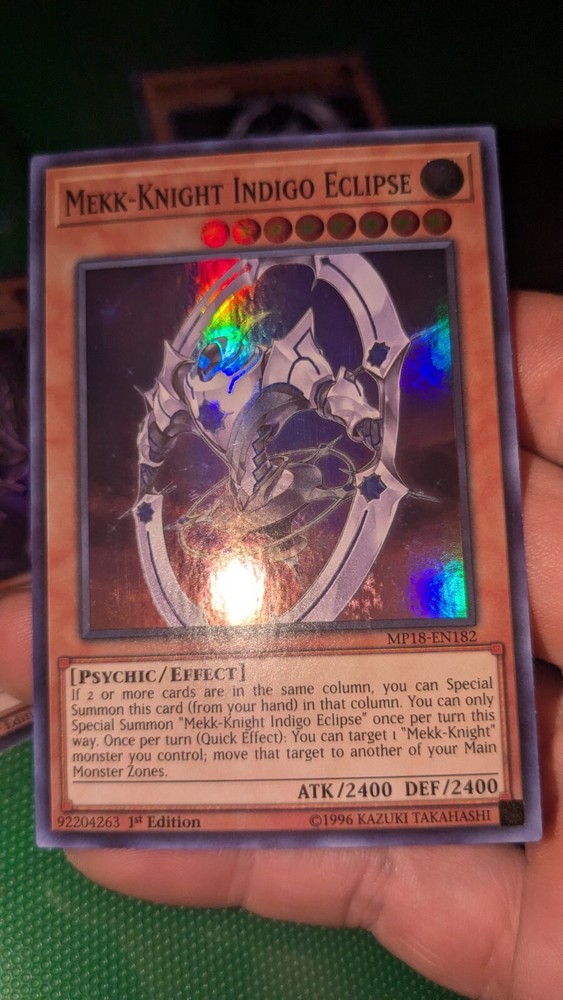 Elevate your Yu-Gi-Oh! TCG collection with the Mekk-Knight Indigo Eclipse, a formidable Psychic-type card from the 2018 Mega-Tins Mega Pack. Card number MP18-EN182, this Effect-type creature boasts an impressive 2400 Attack/Power and 2400 Defense/Toughness, making it a force to be reckoned with in any duel. The card is a 1st Edition Super Rare, ensuring its uniqueness and value to collectors. Printed in English and manufactured by Konami, the Mekk-Knight Indigo Eclipse is a must-have for players and collectors alike seeking to enhance their game or preserve a piece of Yu-Gi-Oh! history.