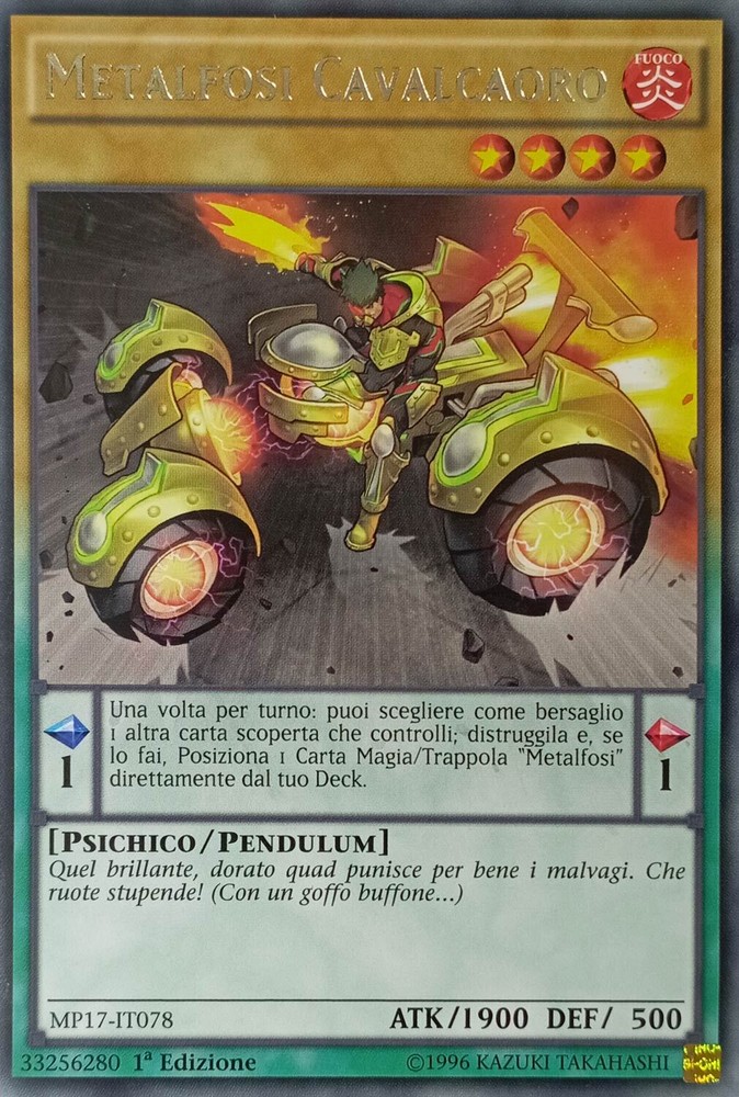 Metalfosi Cavalcaoro - Rara - 2017 Mega-Tin Mega Pack - MP17-IT078 - Ita Nuovo Metalfosi Cavalcaoro - Rara - 2017 Mega-Tin Mega Pack - MP17-IT078 - Ita Nuovo Una volta per turno: puoi scegliere come bersaglio 1 altra carta scoperta che controlli; distruggila e, se lo fai, Posiziona 1 Magia/Trappola “Metalfosi” direttamente dal tuo Deck. Quel brillante, dorato quad punisce per bene i malvagi. Che ruote stupende! (Con un goffo buffone…) Shipping Shipping cost: Italy Posta 1 -> 2,95 Corriere Espresso -> 5,99 Outside Italy Priority - 8,00 Delivery time: La Spedizione Viene Effettuata entro i 5 giorni successivi al pagamento dell'ordine. Payment Per qualsiasi info contattateci Service Per qualsiasi info contattateci