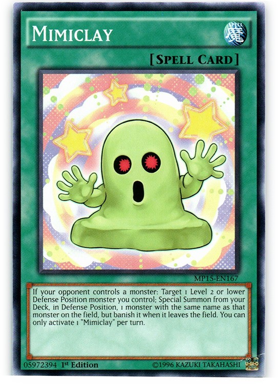 Mimiclay - MP15-EN167 - Common - 1st Edition Image is a stock photo of the card. You will receive the card in Moderately Played condition Condition: Moderately Played ATK/DEF : Ability : Attack #1 : Attack #2 : Attack #3 : Attribute : Spell Card Number : MP15-EN167 Card Rules : Card Text : If your opponent controls a monster: Target 1 Level 2 or lower Defense Position monster you control: Special Summon from your Deck, in Defense Position, 1 monster with the same name as that monster on the field, but banish it when it leaves the field. You can only activate 1 "Mimiclay" per turn. Card Type : Normal Spell Card Edition : 1st Finish : HP : Illustrator : Level : Manufacturer : Monster Type : Name : Mimiclay Passcode : 05972394 Pendulum Scale : Rarity : Common Resistance : Retreat Cost : Set : 2018 Mega Tin Pack Stage : Weakness : Be sure to visit our store for a wide selection of your favorite cards! We are running specials RIGHT NOW!! Shipping Options: ~Ships in a regular white envelope with a stamp for FREE! (THERE IS NO TRACKING INFORMATION AVAILABLE FOR THE ABOVE METHOD. SHIPPING TIME IS 4-10 BUSINESS DAYS) ~Ships in a TRACKEDbubble mailer for $5.99! ~Shipments are handled same or next business day. ~FREE SHIPPING for each additional card, so shop around our store!