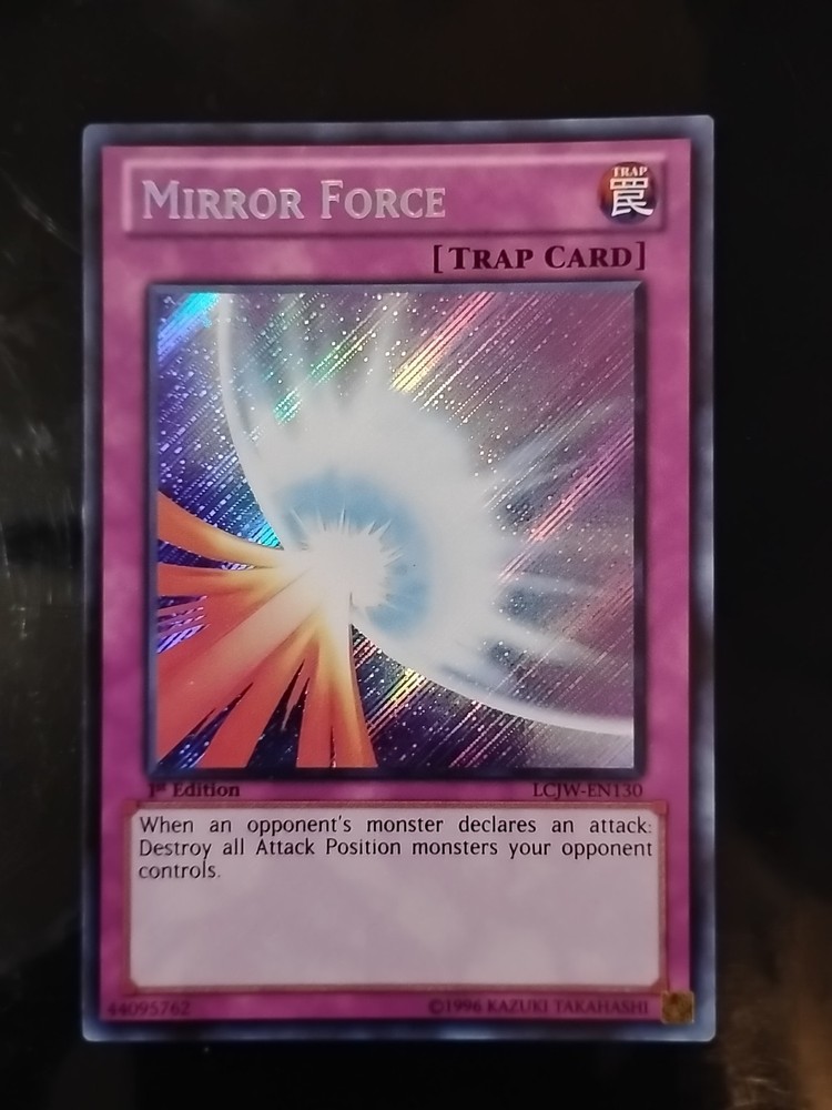 The Mirror Force LCJW-EN130 card is a highly sought-after collectible in the Yu-Gi-Oh! TCG world. This Secret Rare Trap card from the Yu-Gi-Oh Legendary Collection 4: Joey's World-1st Edition set is in English and manufactured by Konami. It features the unique 1st Edition attribute and is classified as a Trap-Normal card, making it a valuable addition to any collector's deck. The card's rarity and association with Joey's World add to its appeal and desirability among fans of the game.